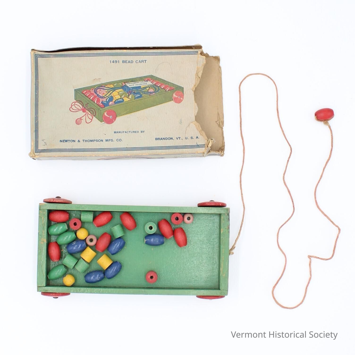 Boxed wooden toy cart and beads. The box shows an illustration of the cart filled with beads and a string along with the label, "1491 BEAD CART". The cart itself is a shallow wooden rectangular box with red wheels and pink string culminating in an oval, red bead for pulling. The cart contains seven oval red beads, five oval blue beads, three oval green beads, three cylindrical red beads, five cylindrical green beads, two cylindrical yellow beads, two round red beads, and two round yellow beads.Context