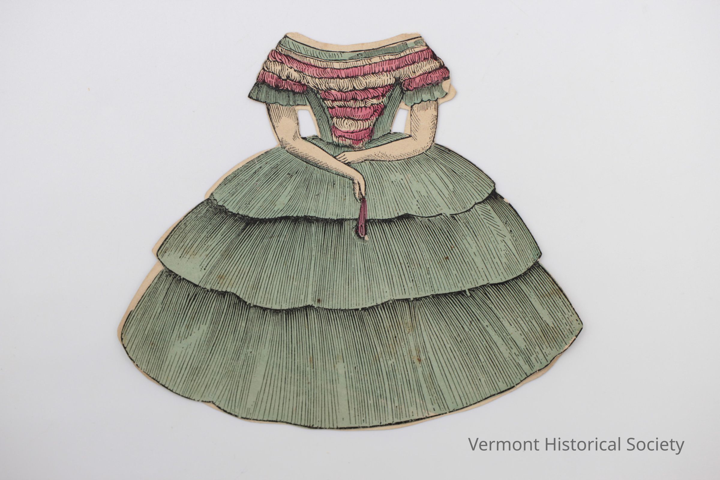 Double-sided paper doll dress. The dress is green/blue with short sleeves and pink and white ruching on the sleeves and center bodice. The skirt is wide and reaches the doll's mid-shin. The right hand is holding a pink fan. The reverse shows the back of the same dress, which is almost identical except for the arms being in the front. The two pieces are connected at the upper shoulders to slide over the doll. The back of the front piece (inside) is labeled in pencil, "Minnie Bennet ball dress".Acquisition