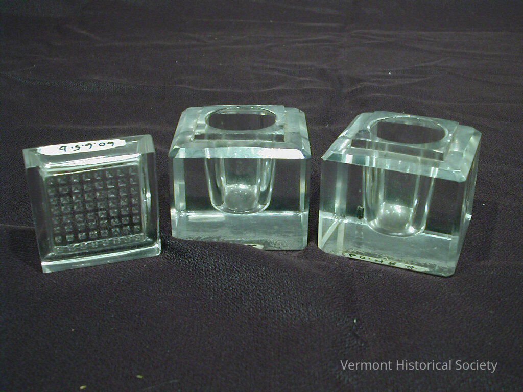 Two clear glass inkwells and one cover. The inkwells are square with a round, narrow well in the center. The lid is also square, and has square facets cut out of the top, evenly spaced.