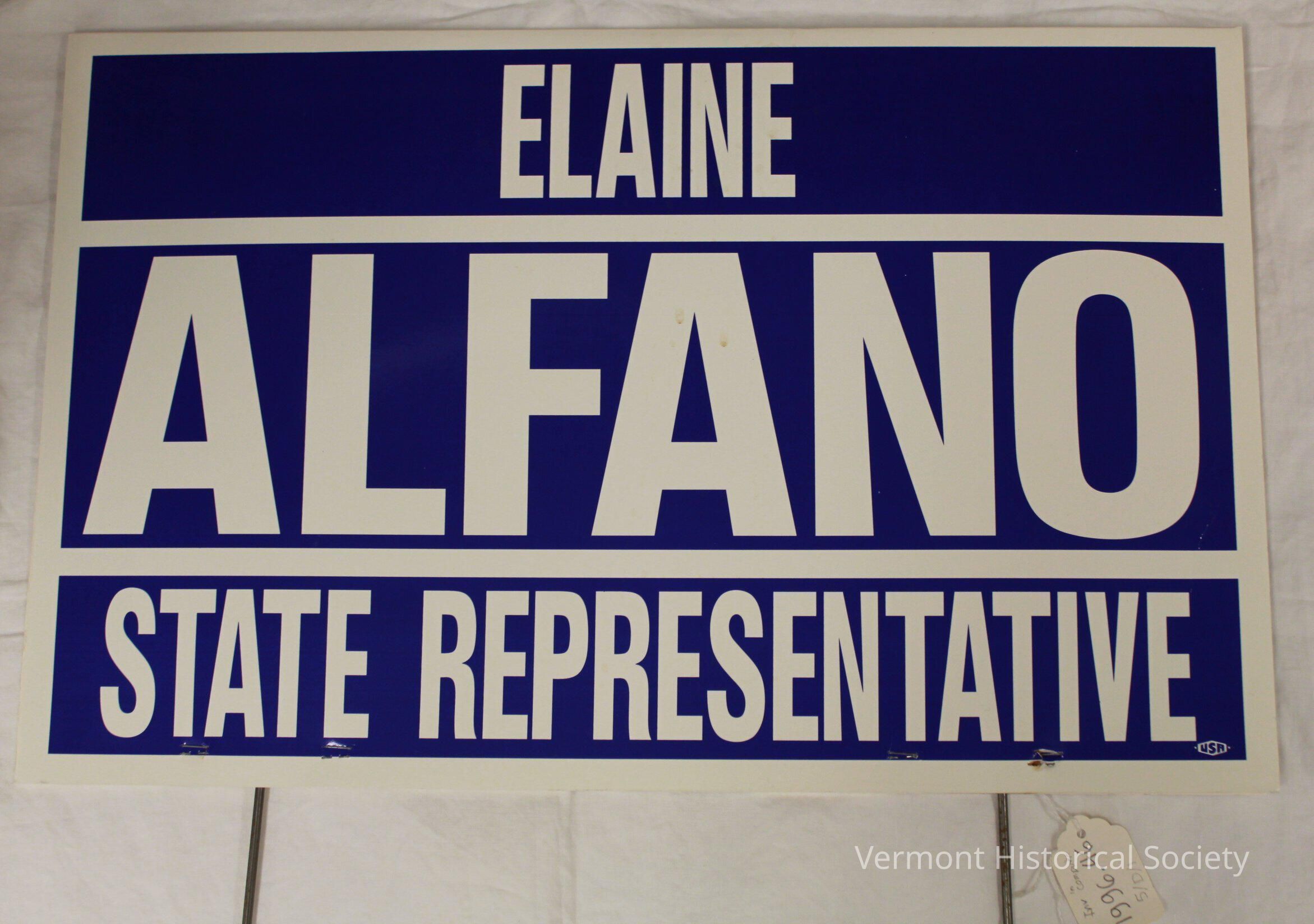 Blue and white sign that reads: "ELAINE ALFANO STATE REPRESENTATIVE." The sign is made up of a piece of waxed paperboard folded over a wire pole that has been squared off and then is pressed into the ground. The same information is on both sides of the sign.