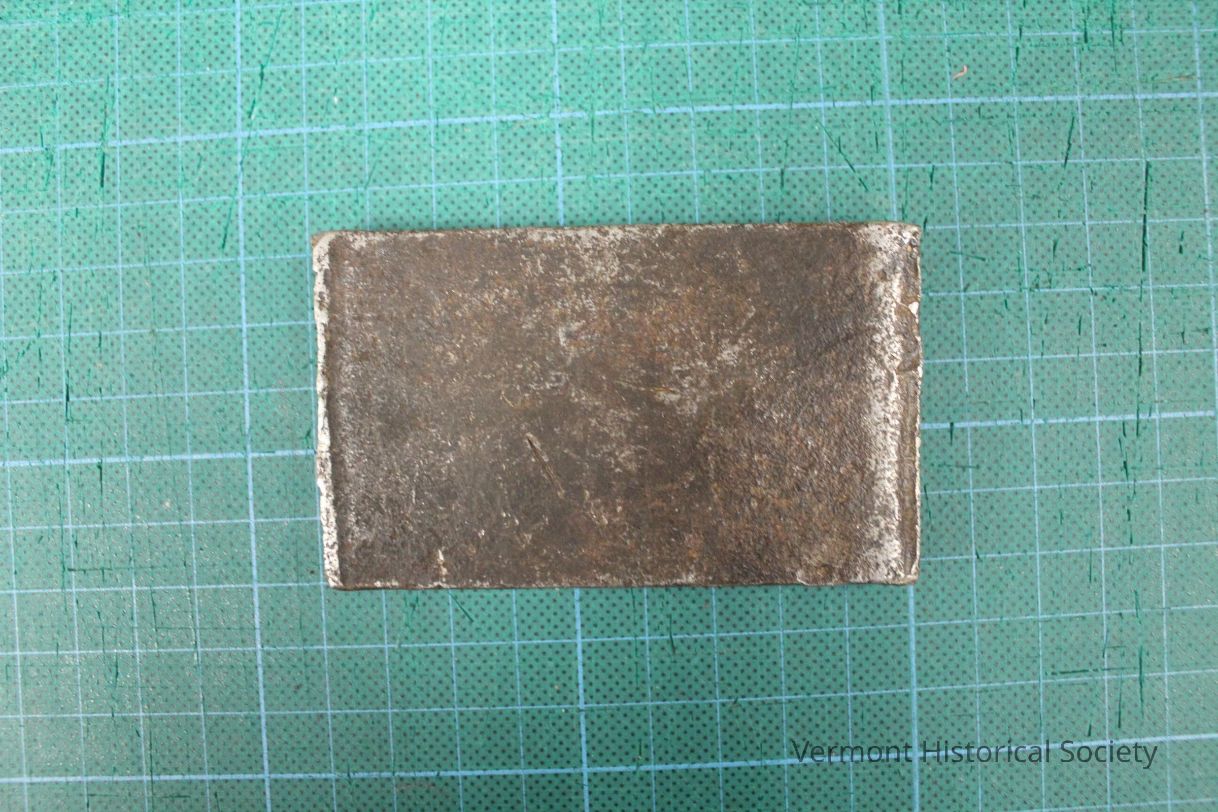 Rectangular piece of metal. It is illegibly marked on one side.Context