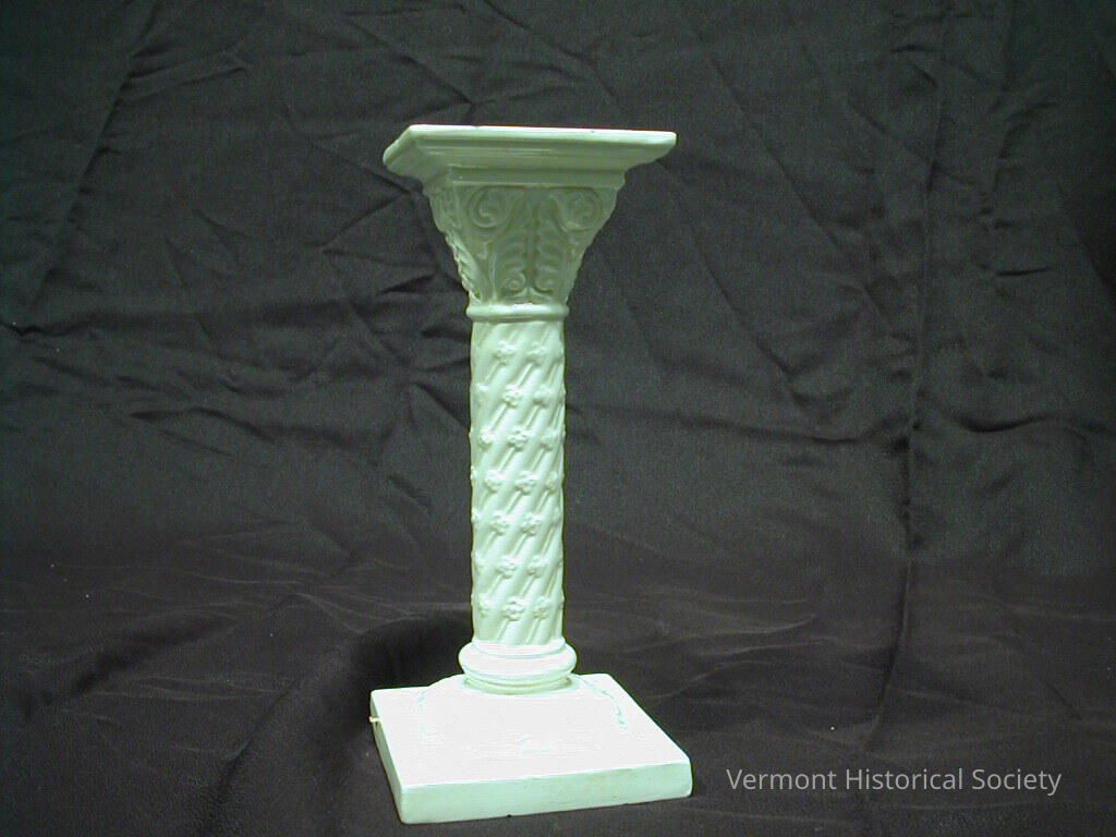 White salt-glazed ceramic candlestick molded to look like an architectural column. It has a square base and top.