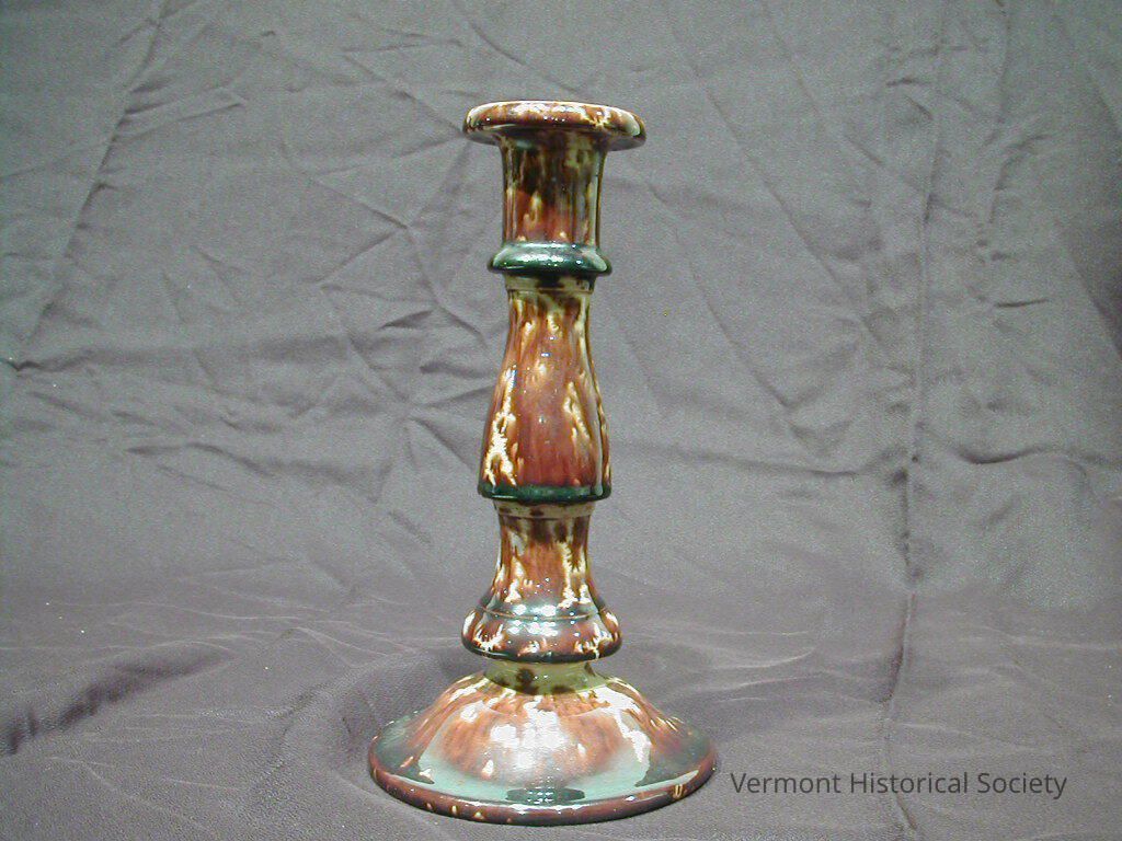Ceramic candlestick with mottle brown glaze. It has a round base and the shaft is molded into three vasiform sections.
