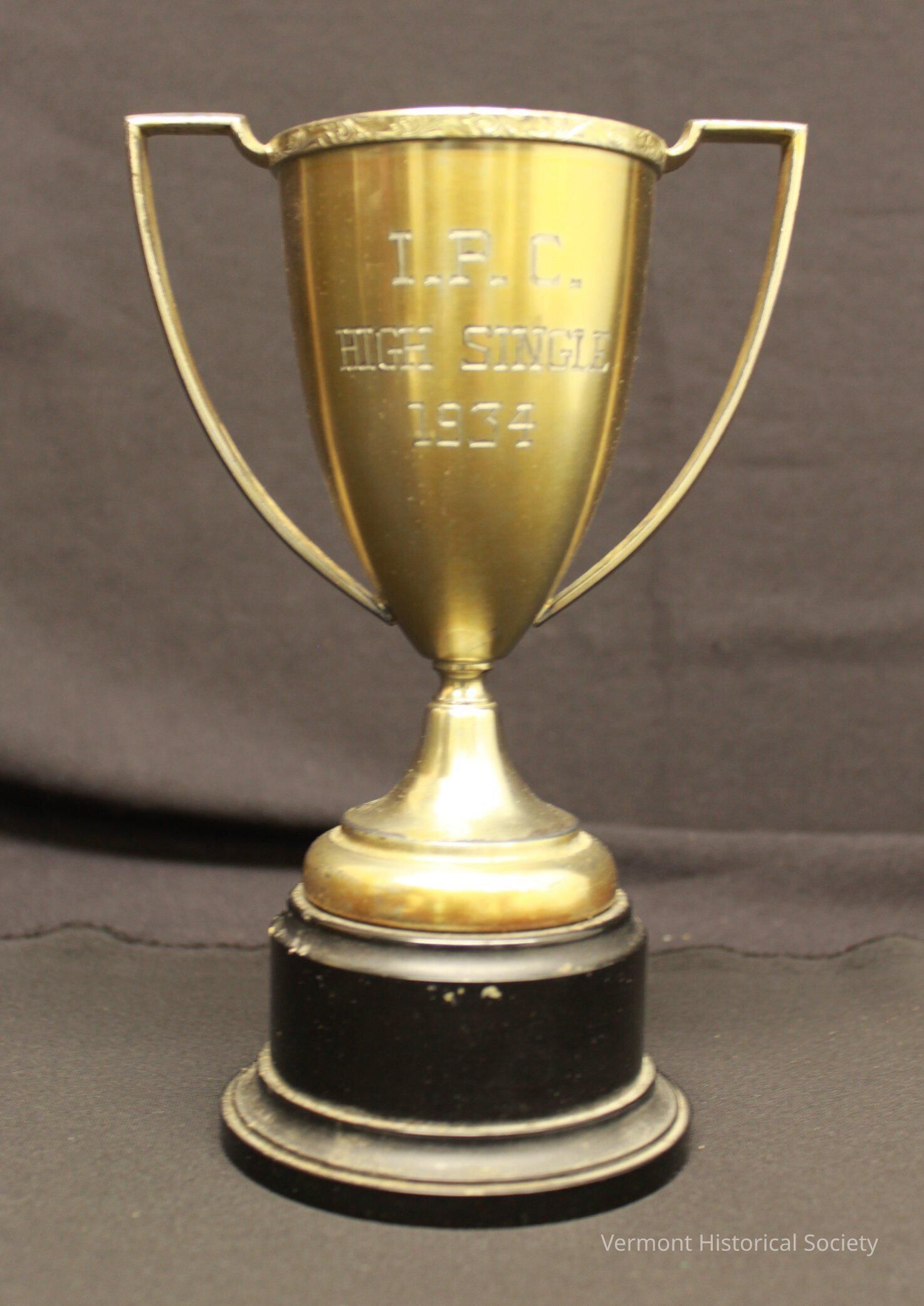 Metal trophy consisting of a double-handled loving cup on a round wooden pedestal. One side of the cup is engraved with the inscription, "I.P.C. HIGH SINGLE 1934". The cup attaches to the base with a bolt accessible from the bottom of the base, which is hollowed out. surrounding the bolt hole is the maker's mark, "Bechard Trophies Trade Mark Made in U.S.A."Context