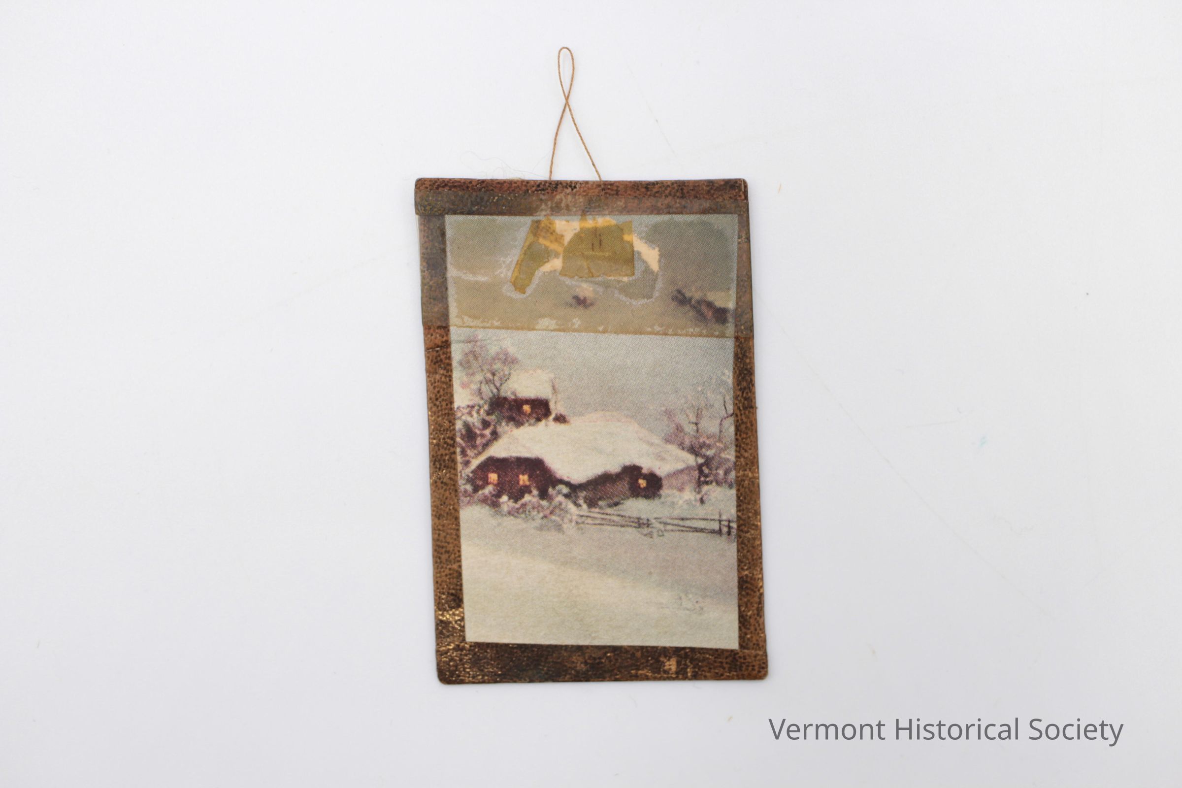 Miniature wall hanging sized for a dollhouse. The piece consists of a small print showing a snowy winter scene with a large house. The edges are bound with textured, metallic tape. There is a loop of gold thread at the top for hanging.Context