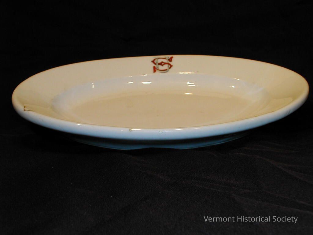 Thick, ceramic oval plate. The plate has a deep center well and flared rim. The top center of the rim has the initials "US" intertwined in red and blue.