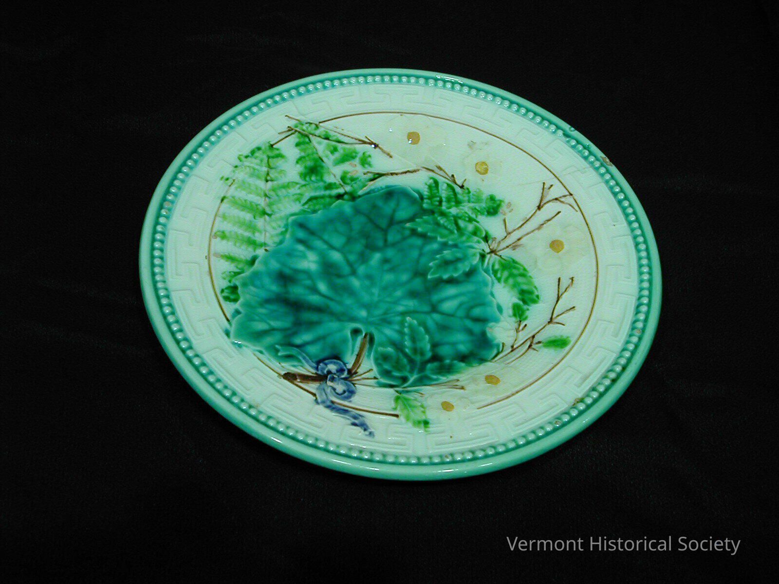 Majolica plate with a design of fern leaves and a large grape leaf on a white ground with a green border.