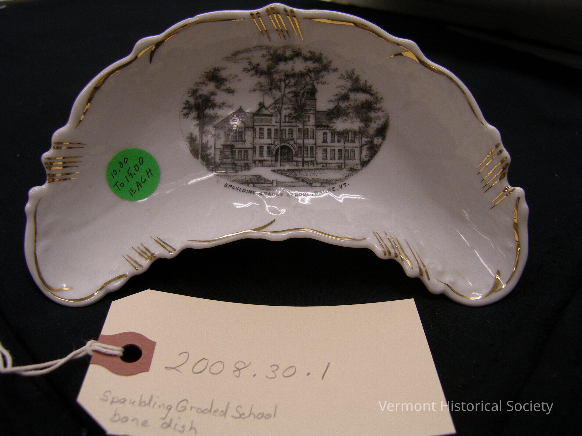 White, crescent-shaped porcelain bone dish with decoratively shaped and gilded edges. The center is printed with an engraved illustration of a Victorian building with an arched doorway, two towers, and monument in front of it. The image is labeled, "SPAULDING GRADED SCHOOL, BARRE, VT." The bottom of the dish is marked, "MADE IN GERMANY C. N. KENYON & CO. BARRE, VT."Context