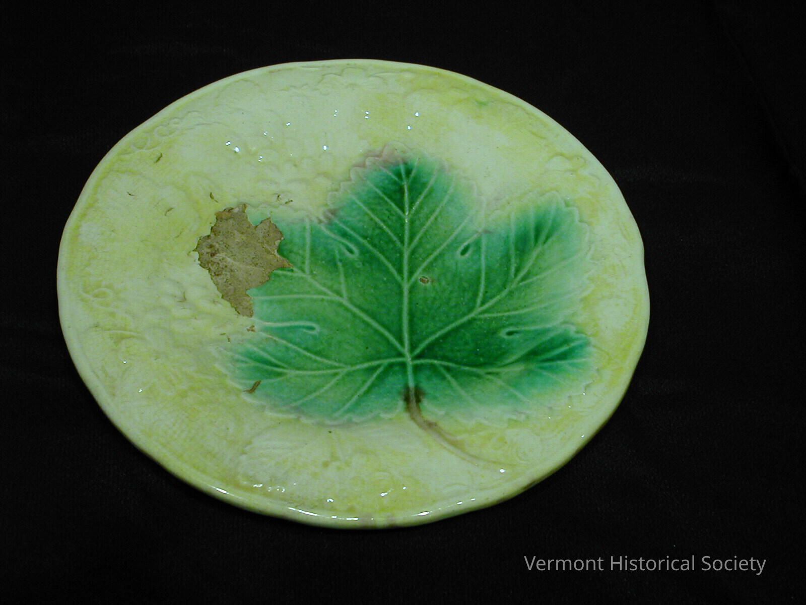 Majolica plate showing a green grape leave on a yellow ground molded with grape clusters.