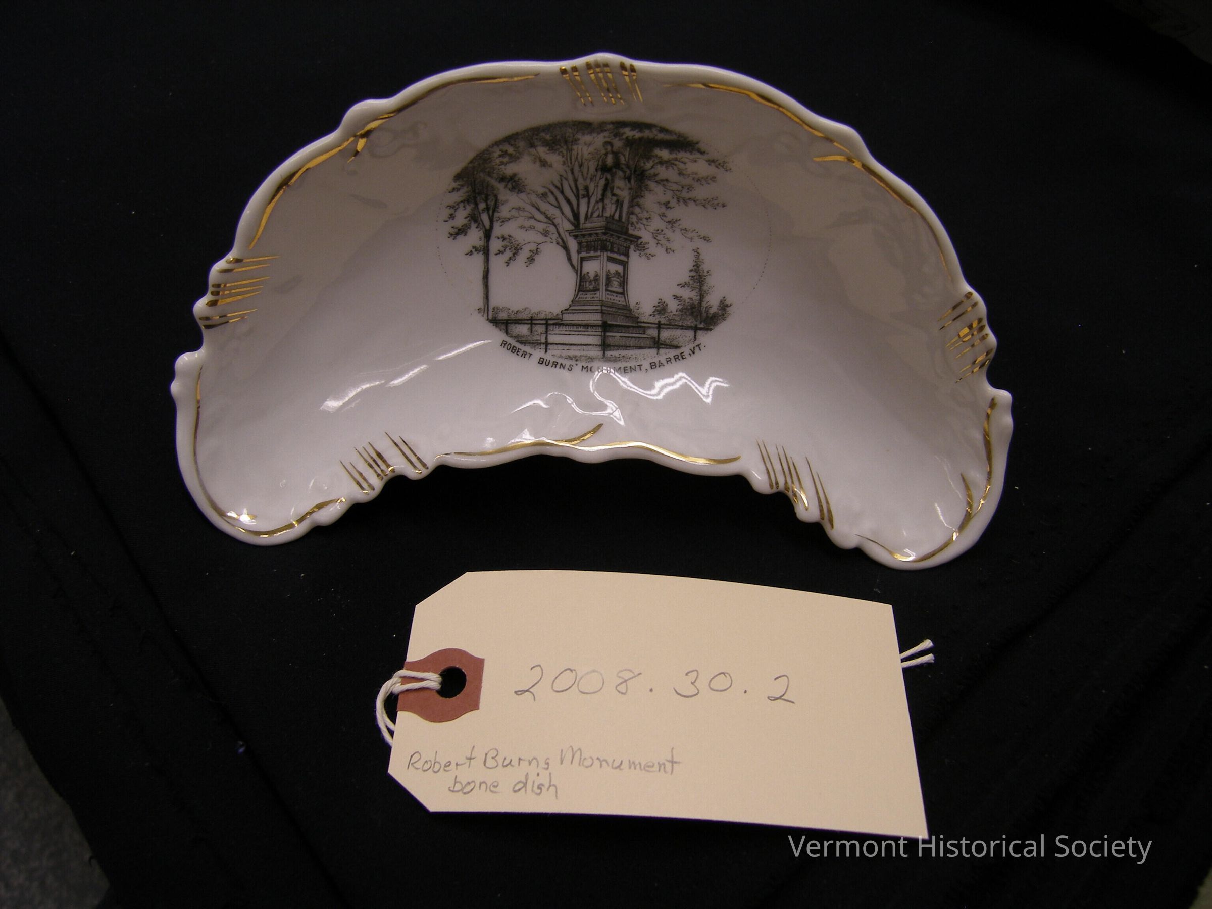 White, crescent-shaped porcelain bone dish with decoratively shaped and gilded edges. The center is printed with an engraved illustration of a monument consisting of a square pedestal and a figure of a man. The image is labeled, "ROBERT BURNS MONUMENT, BARRE, VT." The bottom of the dish is marked, "MADE IN GERMANY C. N. KENYON & CO. BARRE, VT."Context