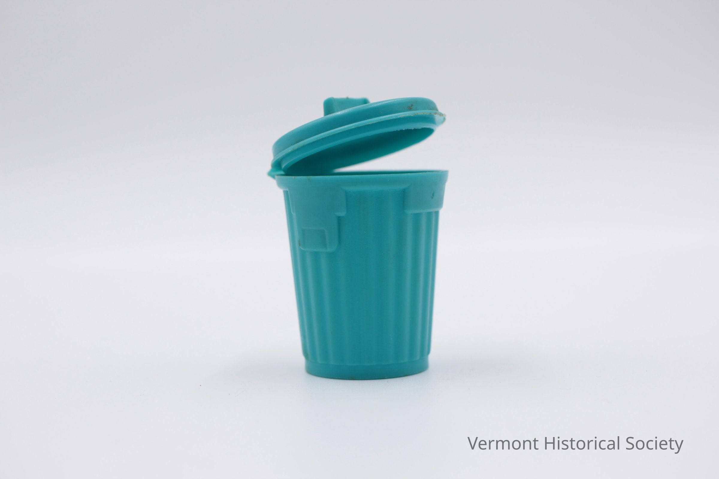 Miniature blue plastic trashcan consisting of a can and attached lid.Context