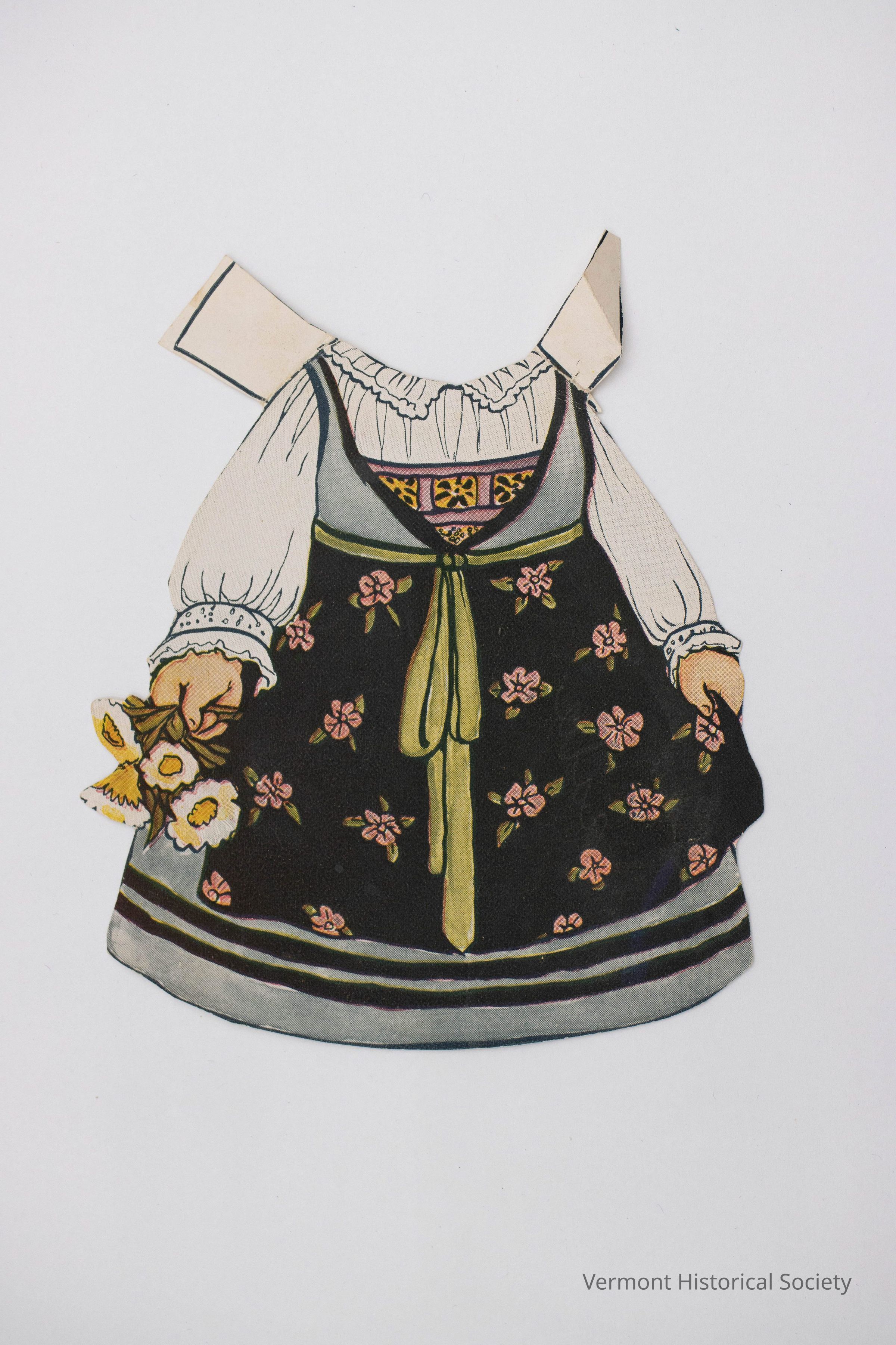 Printed paper dress for a paper doll. The dress depicts a European folk costume. It consists of a white shirt with long sleeves, a blue dress, and a black apron. The back shows a portion of a sales catalog page.Context