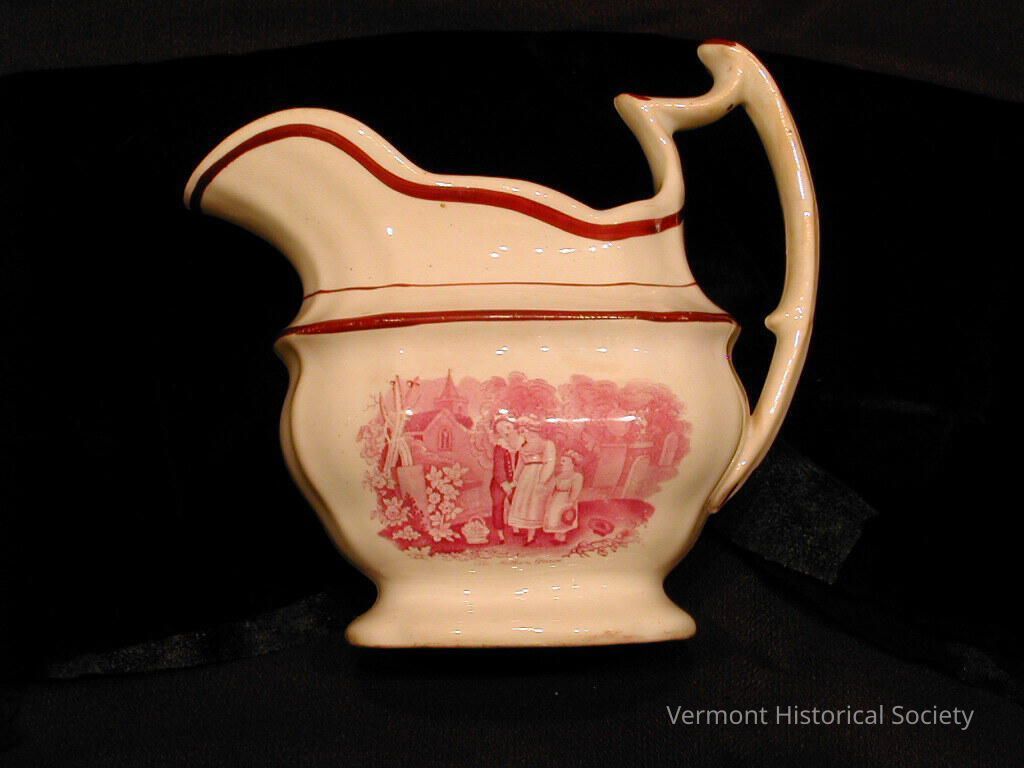 White ceramic cream pitcher. One side is transfer printed in pink with a scene showing three young children holding hands while standing in front of a headstone. There is a small basket of flowers in front of the children and a man’s top hat overturned on the ground behind the children. There is a chapel in the background and flowers around the edges. The bottom of the illustration is labeled “The Mother's Grave.“ The other side is printed with a scene showing a young woman holding a baby with a young child standing behind her. They are shown beside yard or meadow, in front of some large rocks and trees. The illustration is labeled “The Orphans” The shoulder and top edge are striped with lines of pink luster.