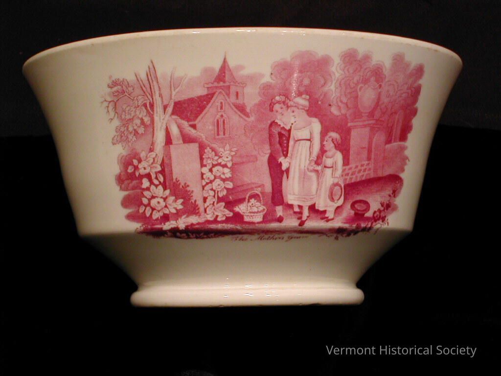 White ceramic footed waste bowl. It is transfer printed in pink with a scene showing three young children holding hands while standing in front of a headstone. There is a small basket of flowers in front of the children and a man’s top hat overturned on the ground behind the children. There is a chapel in the background and flowers around the edges. The bottom of the illustration is labeled “The Mothers Grave.“ The interior of the bowl is striped with two lines of pink luster.