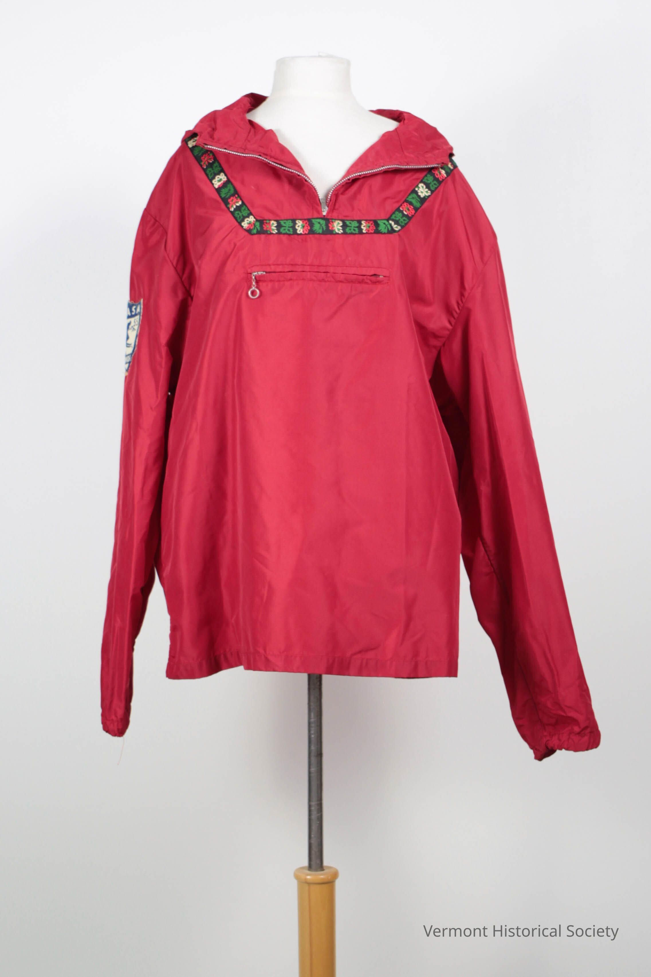 Red nylon ski parka with red, green, white floral tape trim on front and back, near the neck. The neckline zips open to mid-chest, creating a high collar when closed. There is an attached hood. There is a small, zippered pouch on the center front at the bustline. The right sleeve bears a shield-shaped patch with an image of a skier and the inscription, "USEASA 1955 JUNIOR". The cuffs of the sleeves encase elastic. The bottom of the coat is hemmed, but does not encase elastic. A tag at the neck reads, "Lot 1488".Context