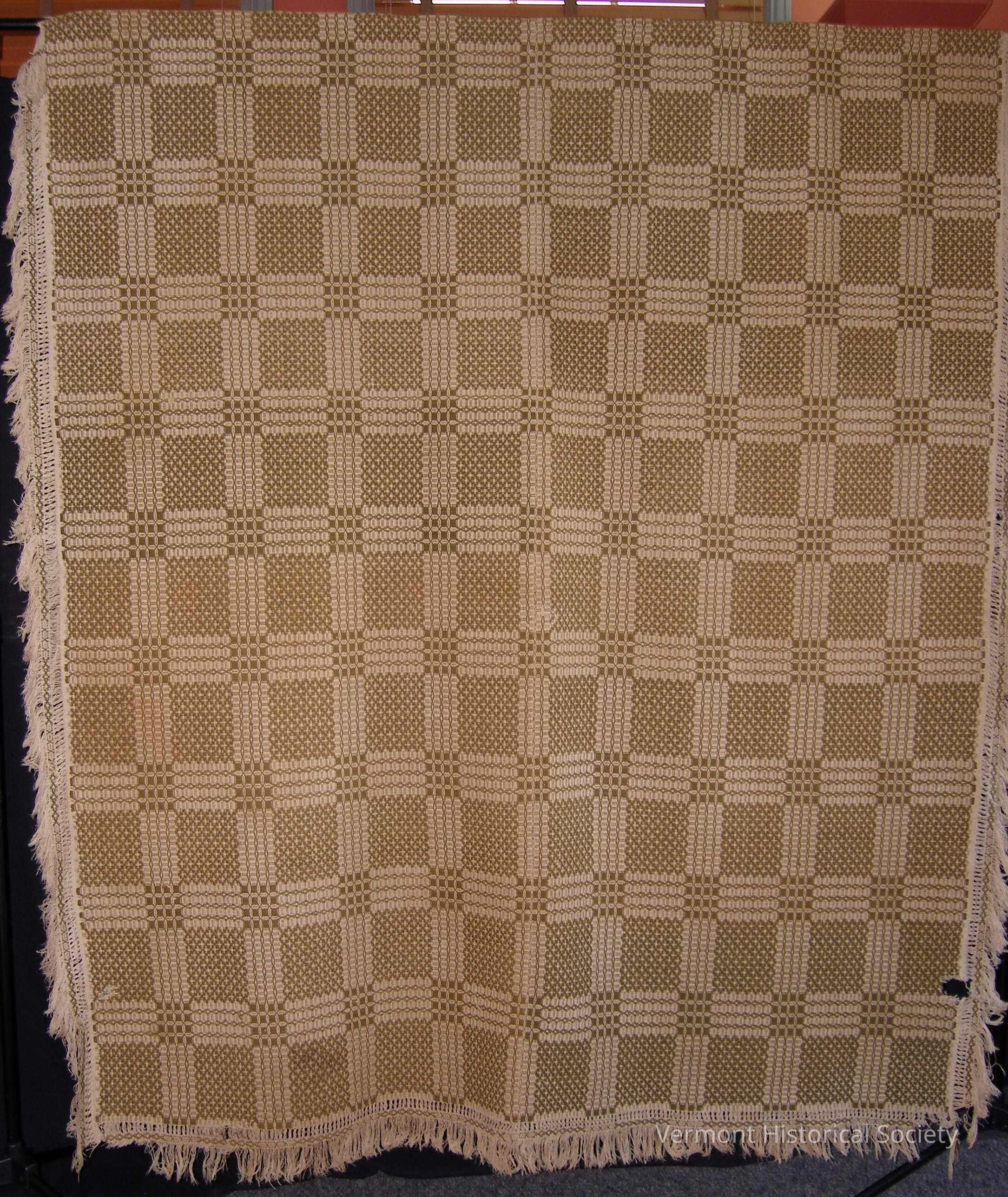 Overshot, or floatwork, cotton and wool coverlet woven in a windowpane plaid pattern. The coverlet is woven from olive green and natural brown 2-ply wool and cotton, with the wool used for the floats and the cotton for the tabby. The coverlet is constructed of two panels, sewn together up the center along the selvedge. Three sides are decorated with a leno fringe that includes a narrow strip of overshot detached from the main body.Context