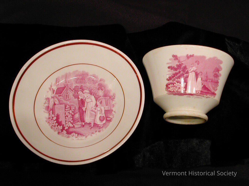 White ceramic tea cup with no handle. One side is transfer printed in pink with a scene showing three young children holding hands while standing in front of a headstone. There is a small basket of flowers in front of the children and a man’s top hat overturned on the ground behind the children. There is a chapel in the background and flowers around the edges. The bottom of the illustration is labeled “The Mother's Grave.“ The other side is printed with a scene showing a young woman holding a baby with a young child standing behind her. They are shown beside yard or meadow, in front of some large rocks and trees. The illustration is labeled “The Orphans”.