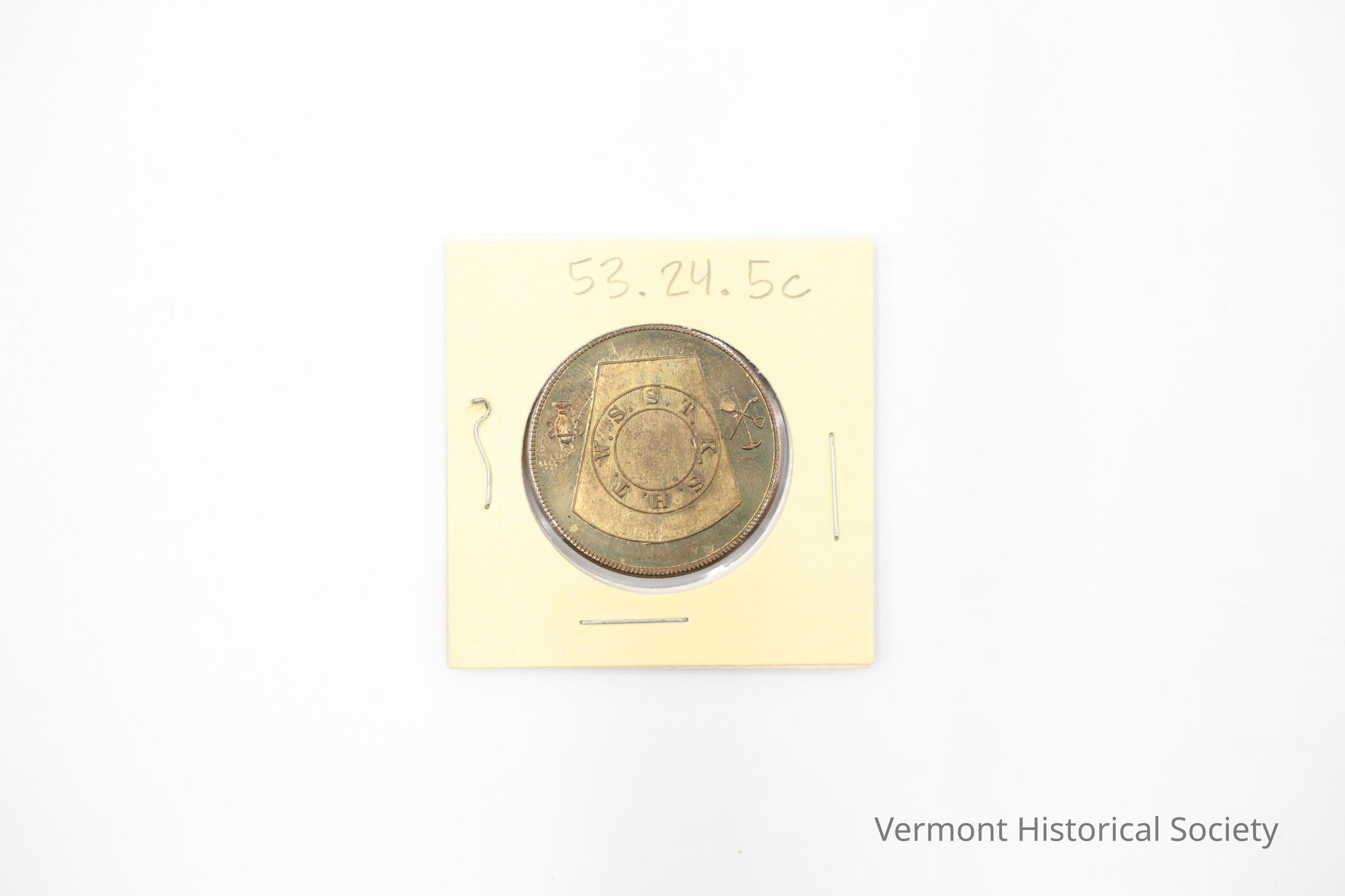 Brass token with masonic imagery on one side and an inscription on the other. One side has a wedge (possibly representing a fez hat) with circle on the inside bearing the inscription, "H T W S S T K S". Flanking the shape are a set of masonry tools and an urn. The other side has the inscription "ONE PENNY" in the center, "SKITCHEWAUG CHAPTER NO. 25 R. A. M. / SPRINGFIELD, VT." around the outer edge, and "CHARTERED JUNE 13, 1873" inside of the first.Use