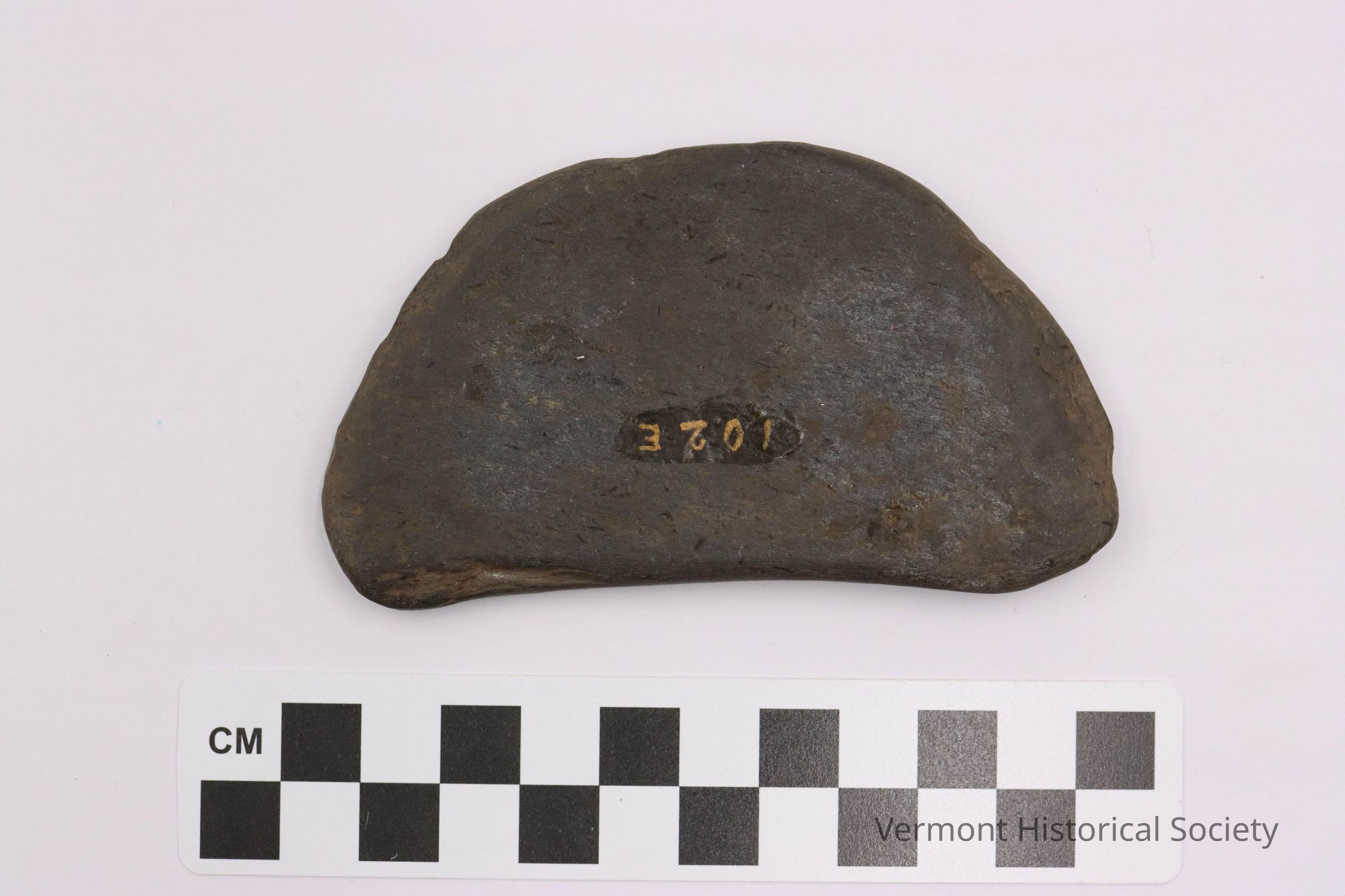 Unidentified ground stone possibly used as a rubbing stone. One side is incised with two parallel lines, possibly caused by a plow.Context
