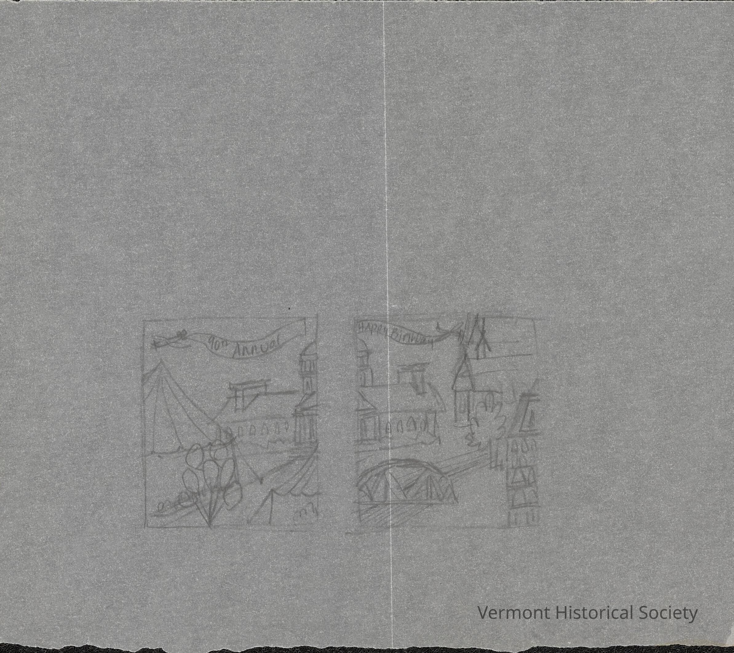 Pencil sketch showing two rectangular panels containing a scenic view of Montpelier, Vermont. The Vermont Statehouse is split between the two panels. The left panel contains a circus tent and balloons. The right panel contains a bridge, church, and building. A banner spans the top of the panels that reads, "40th Annual / Happy Birthday".Type of Drawing