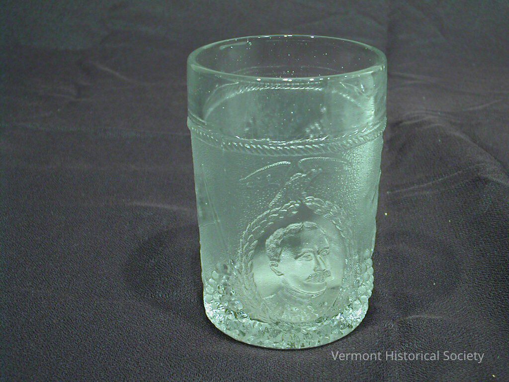 Pressed glass tumbler heavily molded with imagery of Admiral George Dewey and militaria. The glass is molded to have a rough ground, bordered on the top by a rope and the bottom by repeated stacks of cannonballs. One side shows a bust portrait of Dewey within a laurel wreath topped with a flying eagle. The other side shows crossed flags over a cannon.