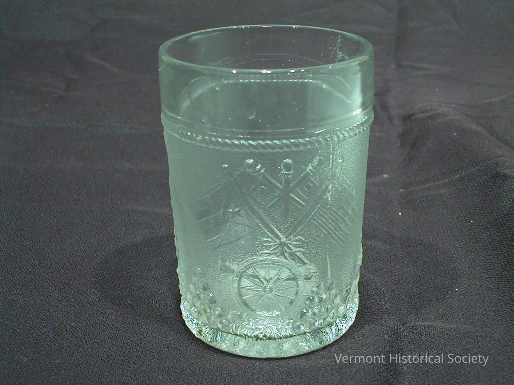 Pressed glass tumbler heavily molded with imagery of Admiral George Dewey and militaria. The glass is molded to have a rough ground, bordered on the top by a rope and the bottom by repeated stacks of cannonballs. One side shows a bust portrait of Dewey within a laurel wreath topped with a flying eagle. The other side shows crossed flags over a cannon.