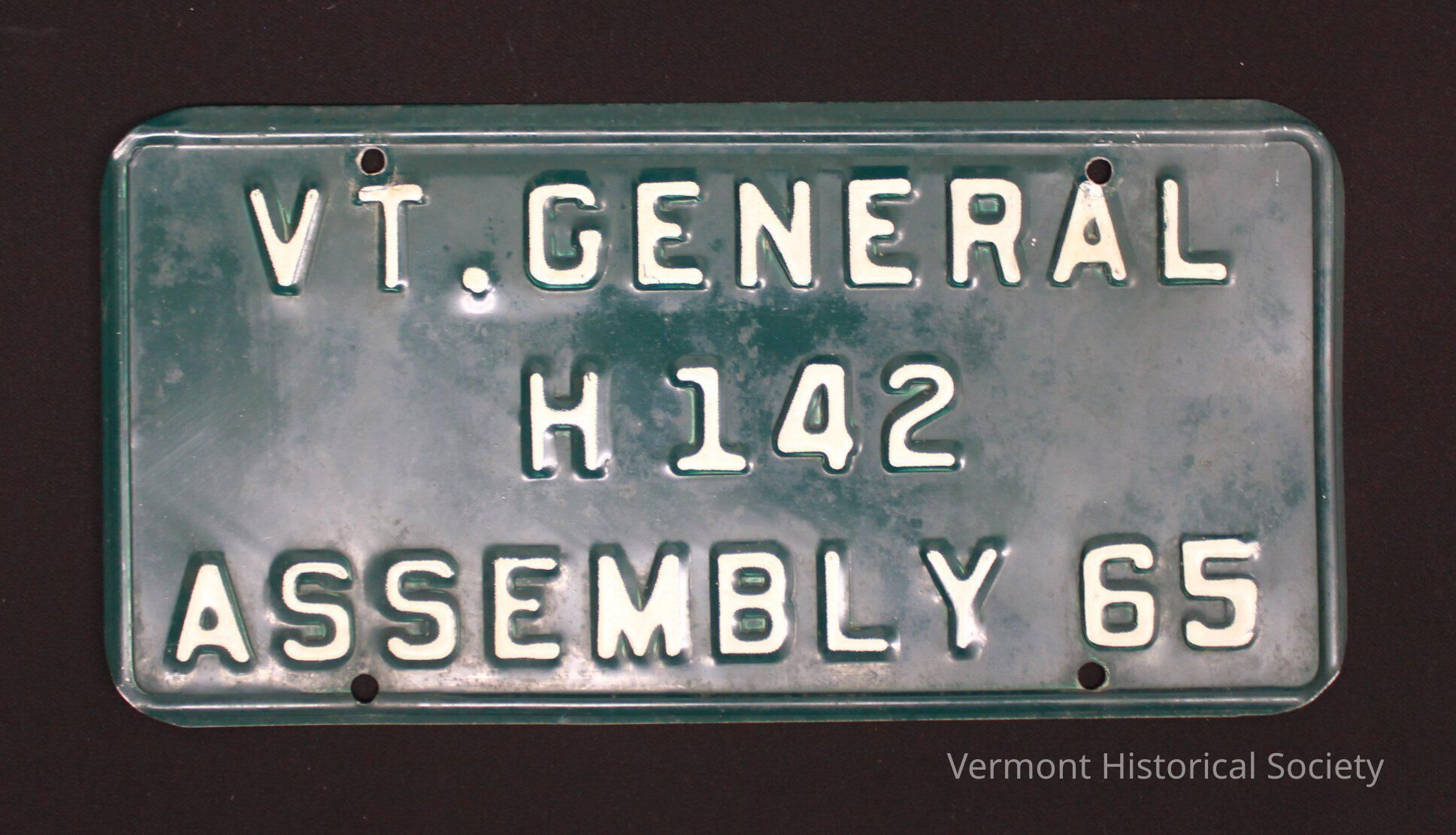 Green metal license plate with the raised inscription, "VT. GENERAL / H142 / ASSEMBLY 65". There are four mounting holes: one in each corner.