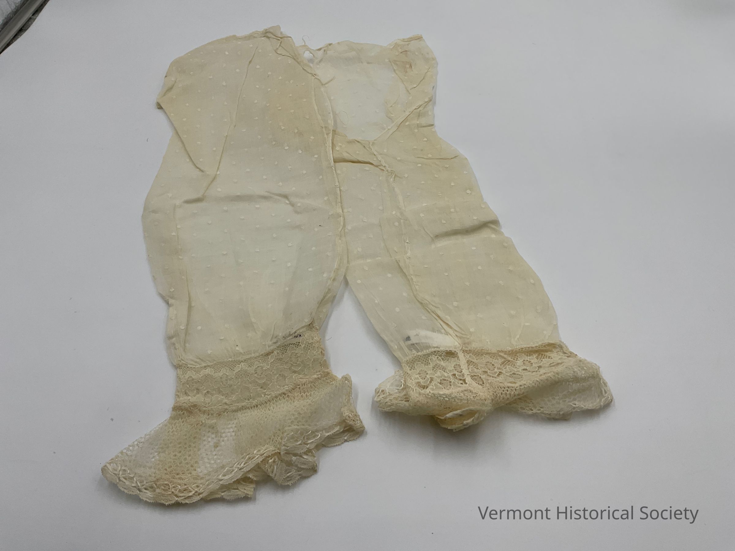 Semi-sheer white cotton undersleeves with ruffled lace cuffs. The arms of the sleeves are woven with spots (Swiss dots).