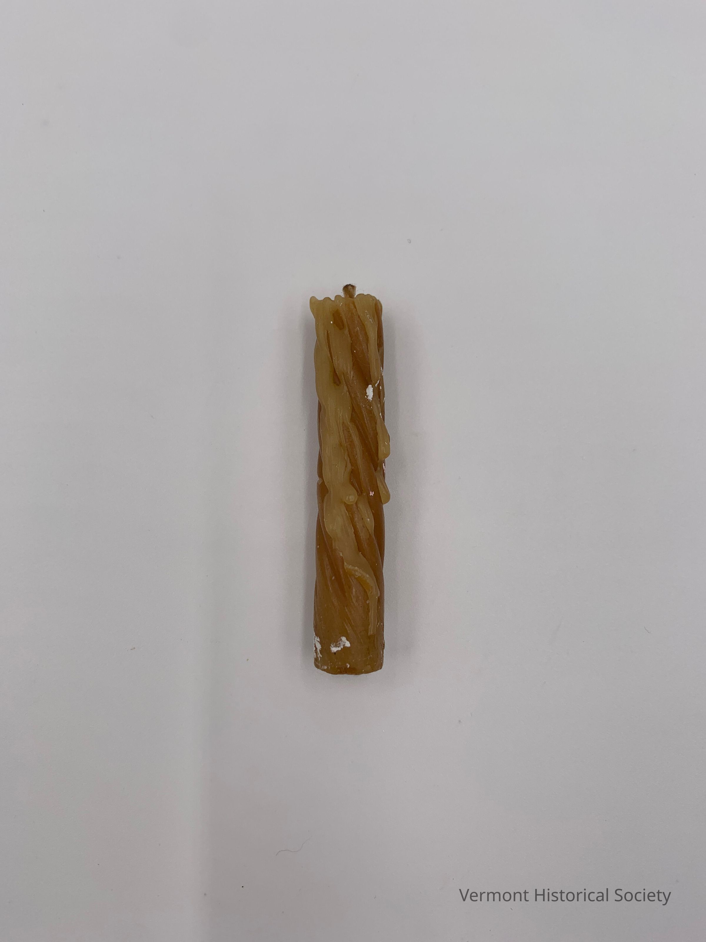 Partially burnt olive-colored wax candle molded with a swirled design.