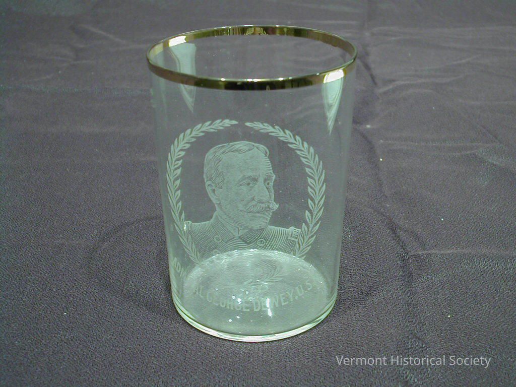 Glass tumbler etched with a bust portrait of Admiral George Dewey within a laurel wreath drawn in a copperplate style. The bottom of the wreath is labeled, "ADMIRAL GEORGE DEWEY, U.S.N." The rim of the glass is gilded.