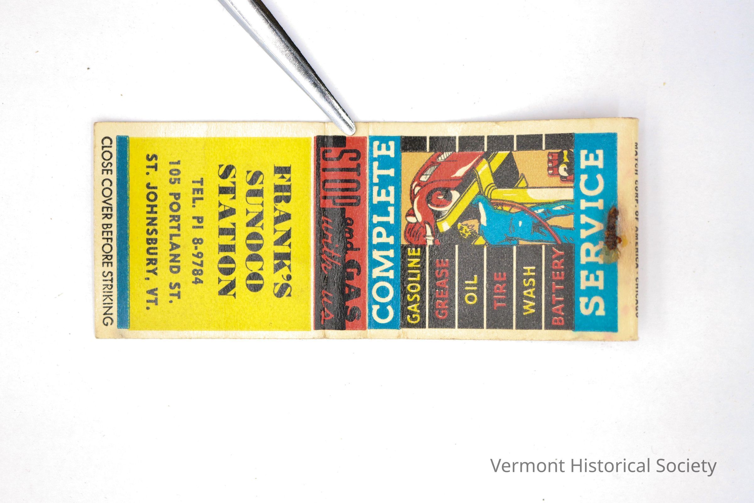 Cardboard bifold matchbook. The front flap is printed with the inscription, "FRANK'S SUNOCO STATION TEL. Pl 8-9784 105 PORTLAND ST. ST. JOHNSBURY, VT."