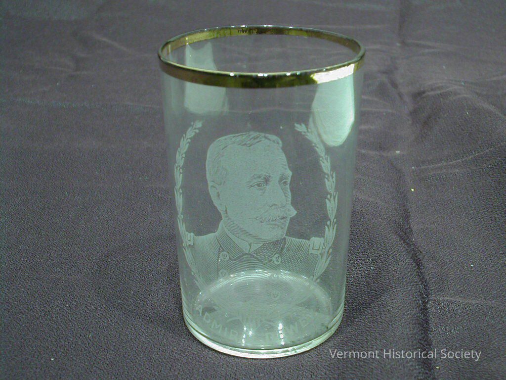 Glass tumbler etched with a bust portrait of Admiral George Dewey within a laurel wreath drawn in a copperplate style. The bottom of the wreath is labeled, "ADMIRAL GEORGE DEWEY, U.S.N." The rim of the glass is gilded.