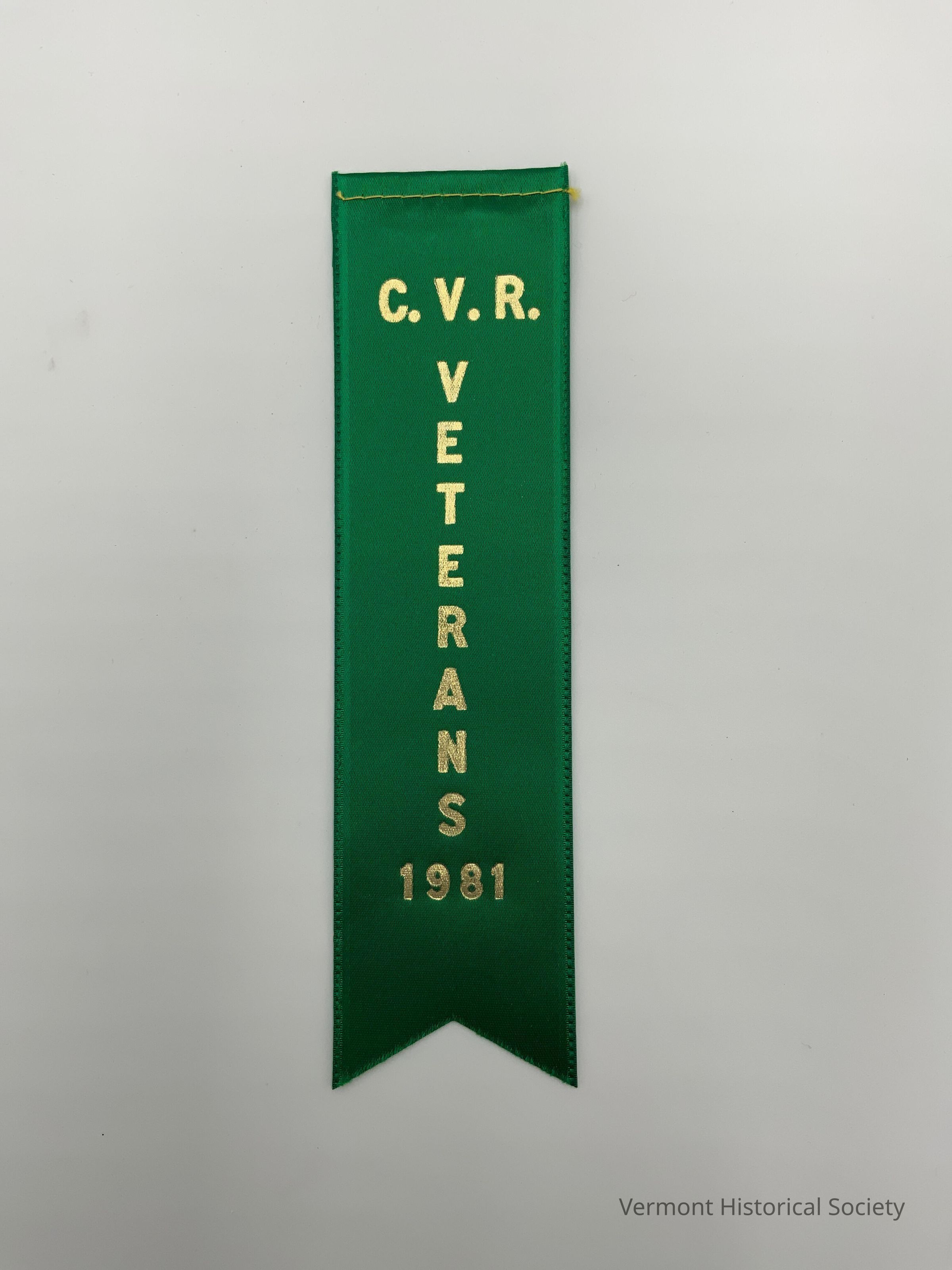 Green satin-woven ribbon with the stamped inscription, "C. V. R. VETERANS 1981". The bottom is cut into two points, and there is a safety pin attached to the top back.