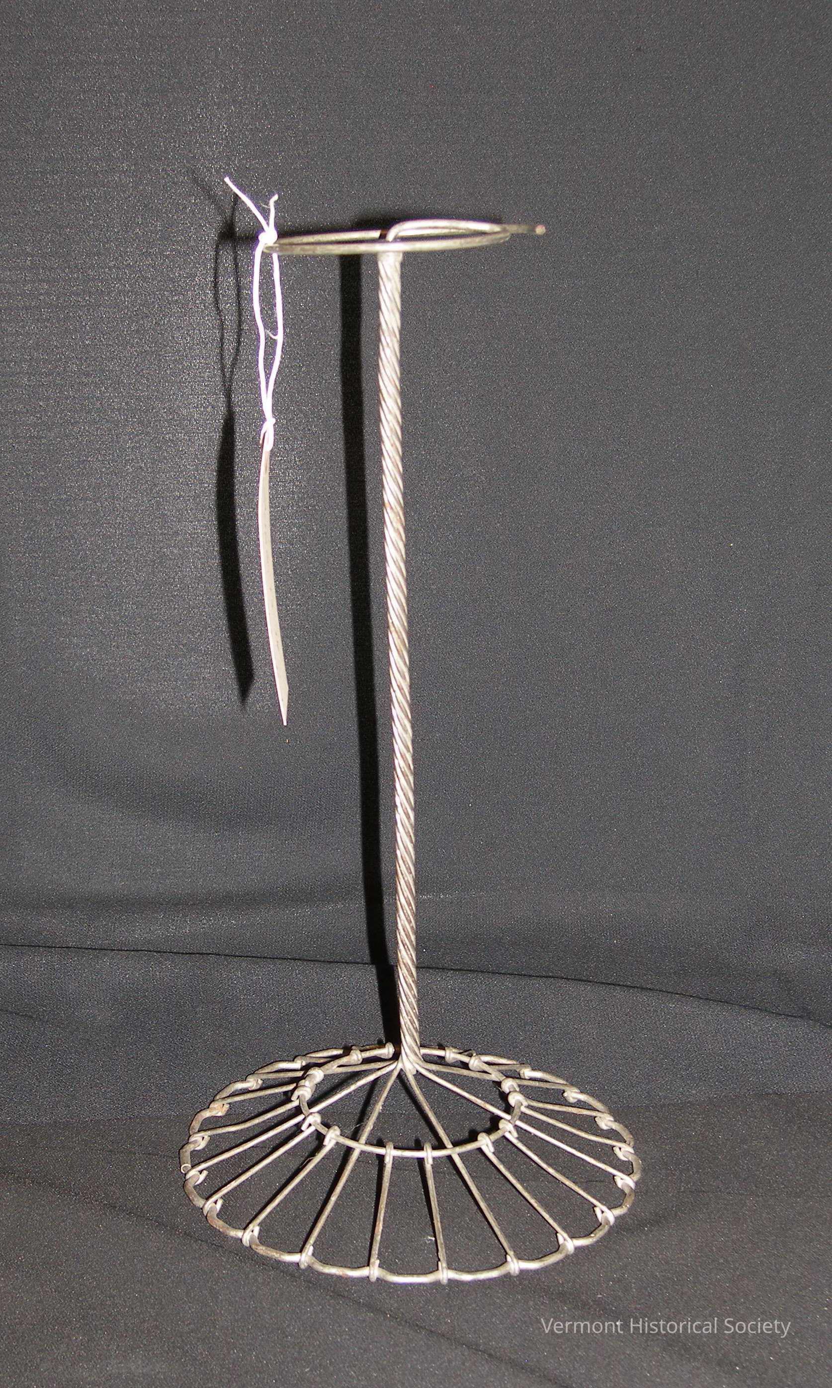 Metal hat stand made of twisted and bent wire.