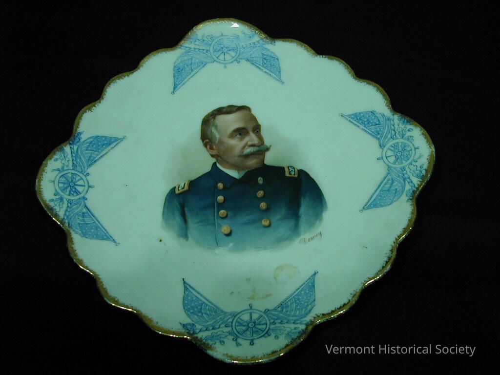 Square, decorative plate printed with a full-color portrait of Admiral George Dewey. He is shown in a blue, double-breasted military coat with rectangular epaulets. Each corner of the plate is printed with a blue-linework design of United States flags crossed behind a ship's wheel.