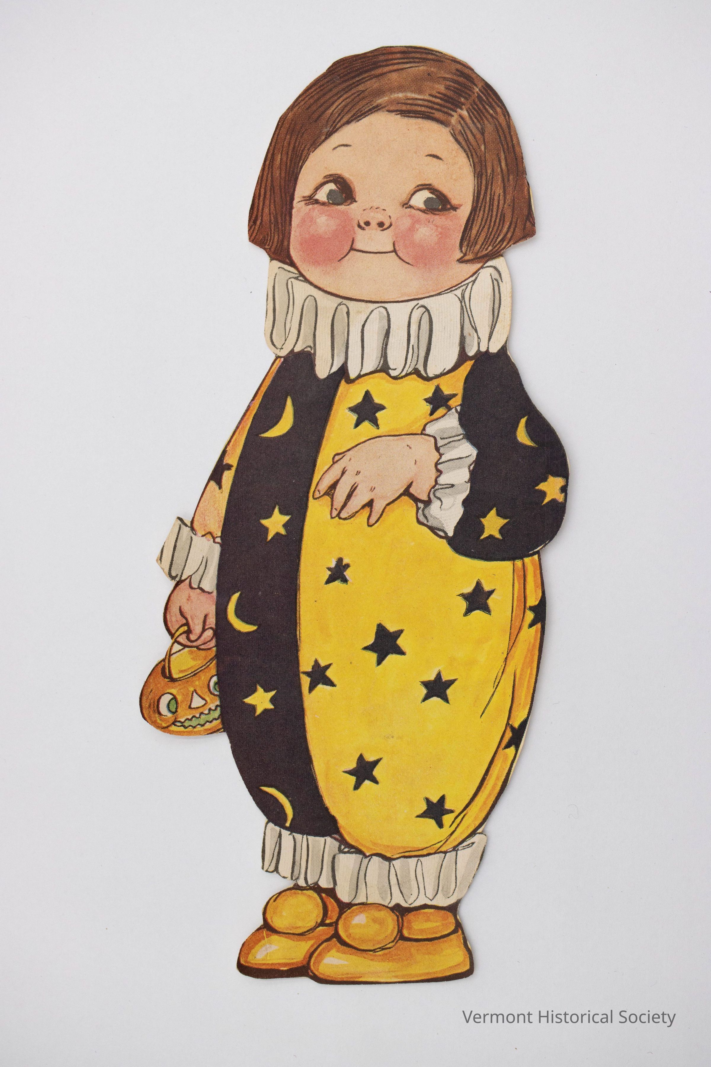 Small paper doll. The doll depicts a young child with brown hair and pink skin wearing a clown costume. The costume consists of a bodysuit printed on one half in black and the other in yellow. One hand is holding a bucket in the shape of a jack-o-lantern. The back shows a portion of a sales catalog page.Context