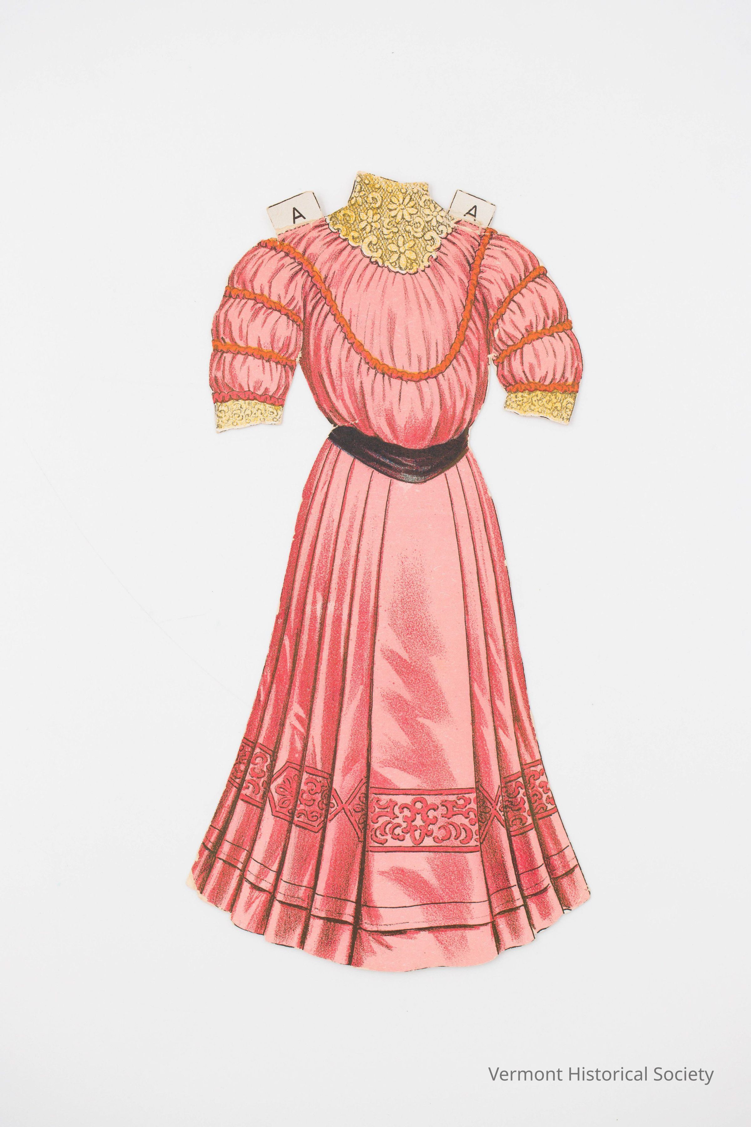 Pink dress for a paper doll. The dress has short, tiered sleeves and a bloused front. The skirt is pleated, and there is a black waistband.Context