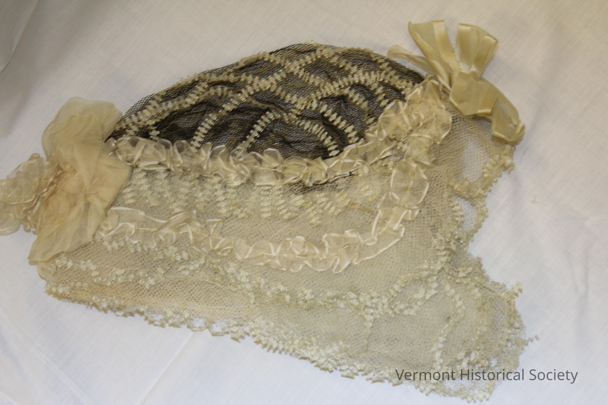 This net cap features short lappets and a crown made of black nettings. The crown is adorned with a black-and-cream ribbon, forming a crosshatched pattern. The cap is bordered all around with cream-color netting, which is embellished with sheer cream-color ribbons. Additionally, there are ribbon bows or rosettes positioned at the center front and center back of the cap.