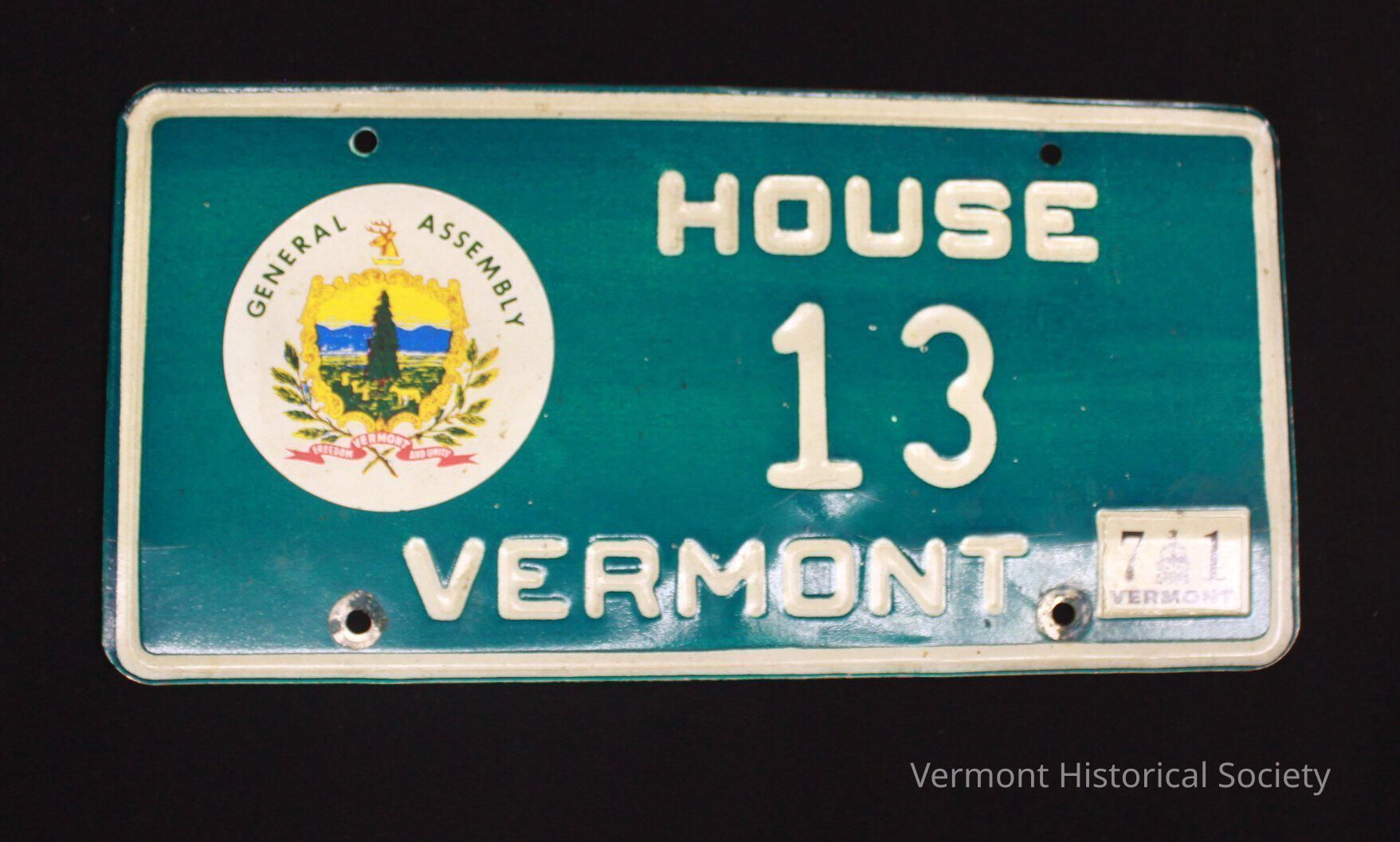 Green metal license plate with the raised inscription, "HOUSE 13VERMONT". There is a white printed medallion on the left with the Vermont state seal in full color and the words, "GENERAL ASSEMBLY". There is a white sticker in the lower right corner that reads, "71 VERMONT". There are four mounting holes: one in each corner.Context