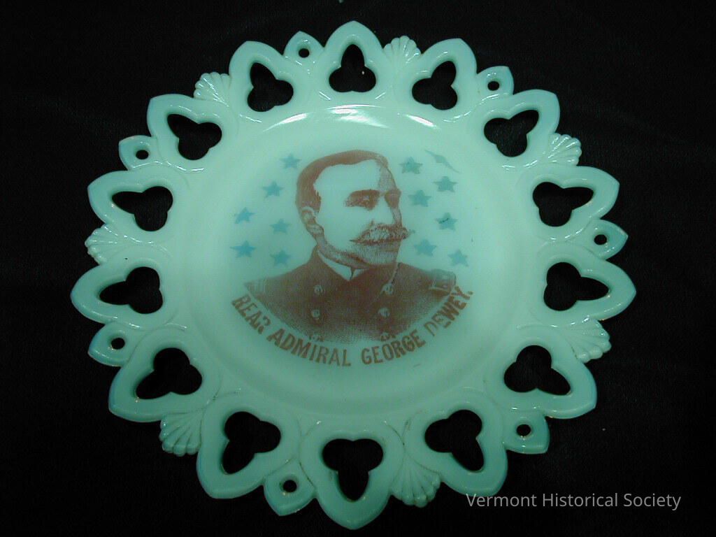 Milk glass plate printed with a bust portrait of Admiral George Dewey surrounded by stars. The edge of the plate is molded into an open design of trifoils.