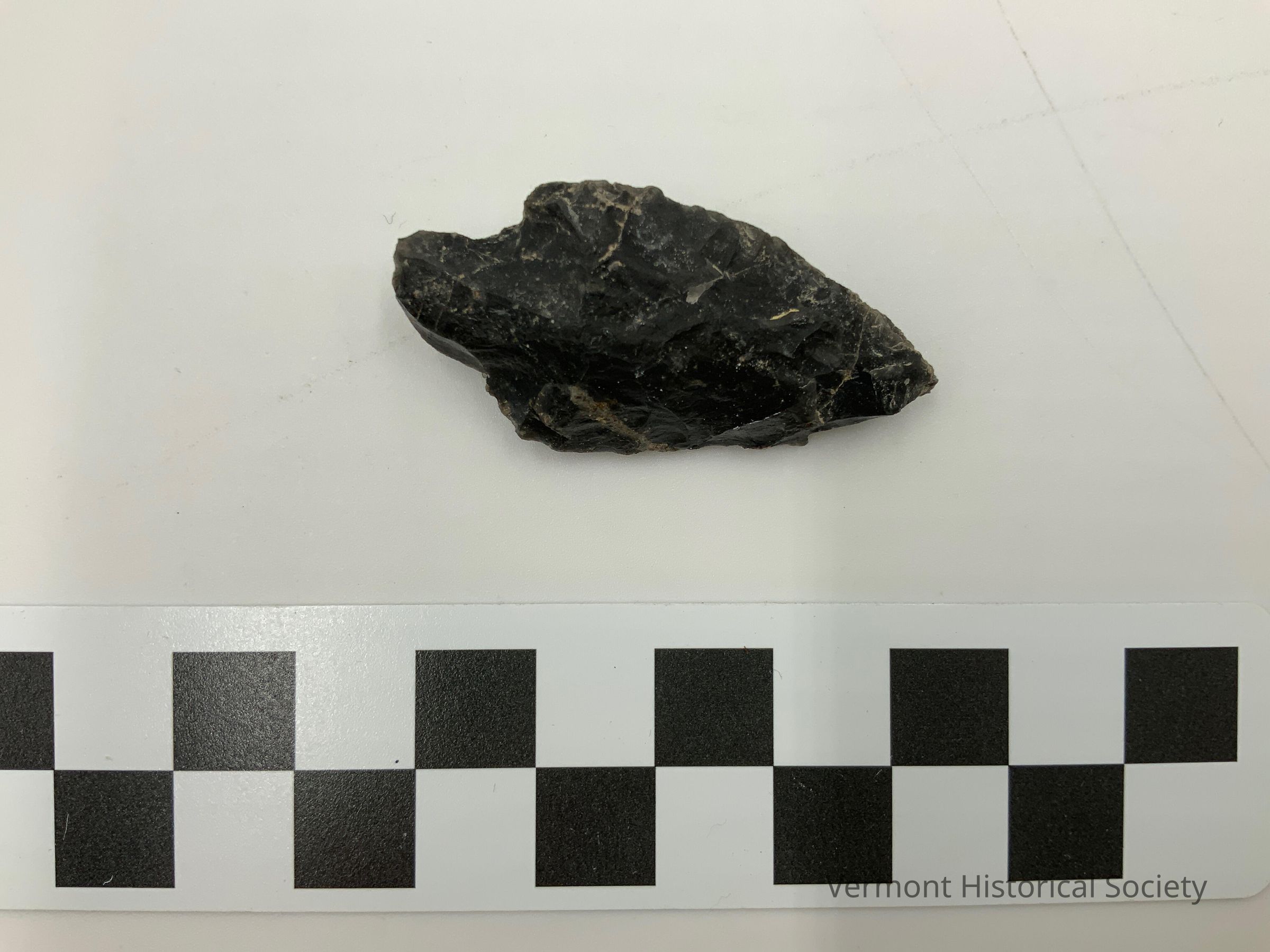 Black chip stone projectile point with a straight stem. The blade edges are symmetrical and curves outward.