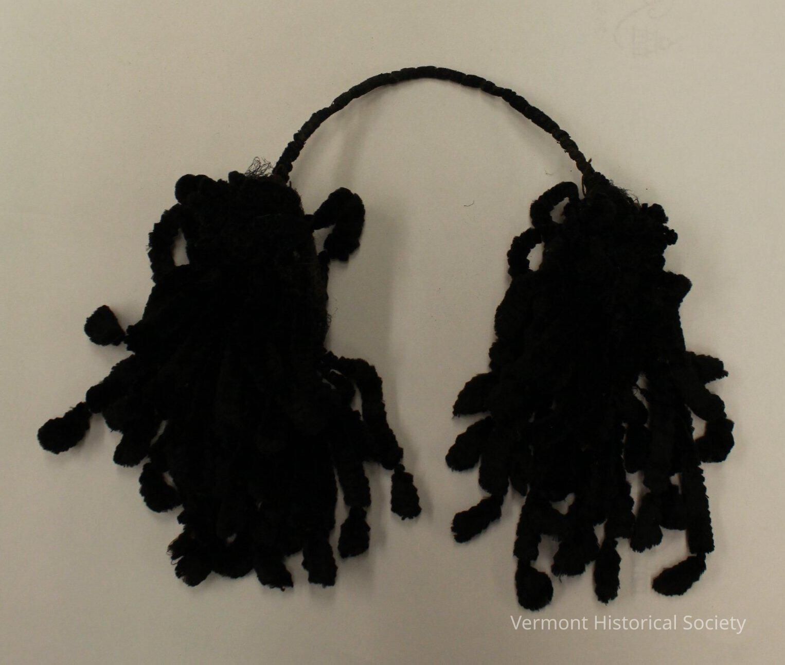 These black chenille earmuffs consist of two ear covers, each covered with loops of chenille yarn. The interior of each ear cover is lined with netting.