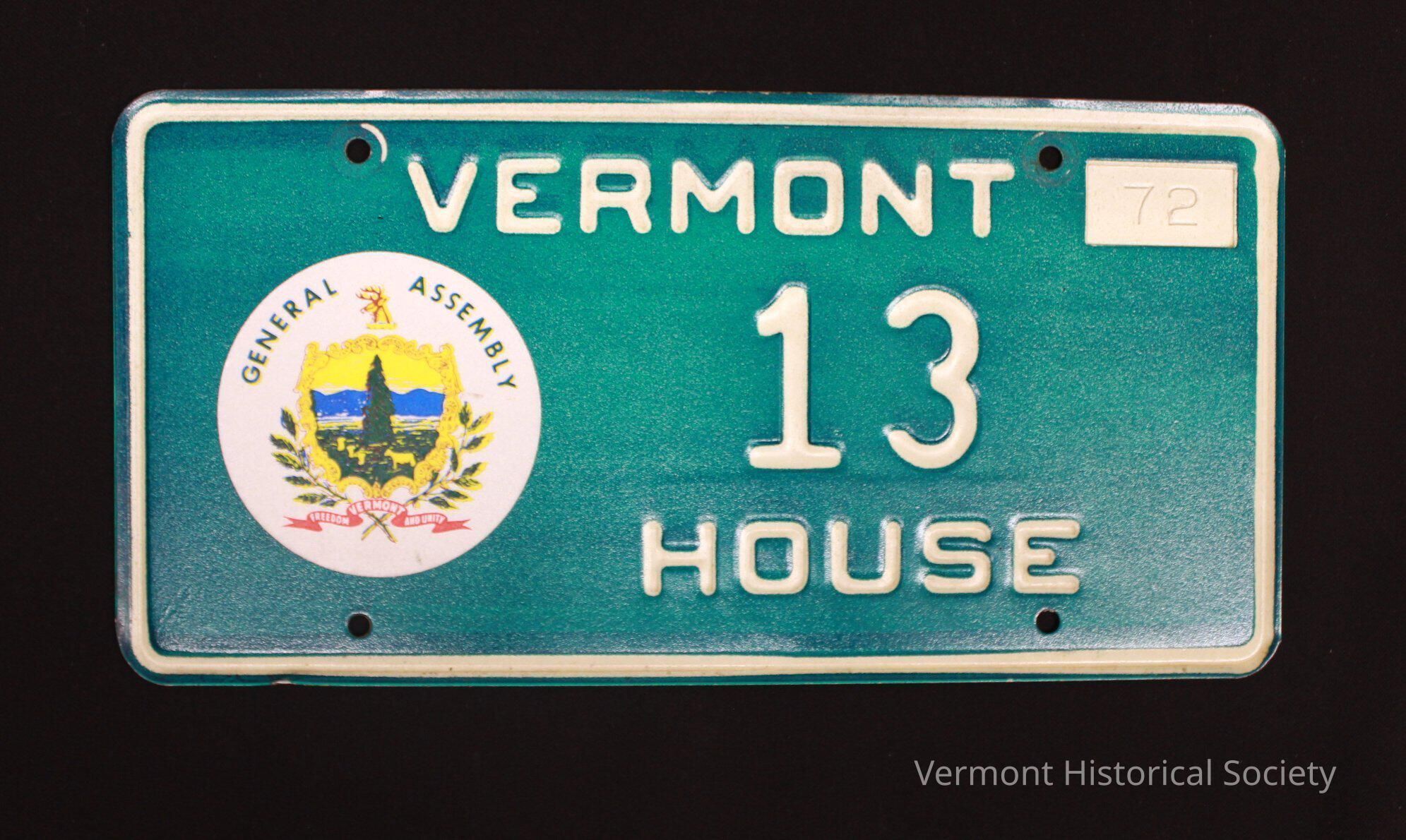 Green metal license plate with the raised inscription, "HOUSE 13 VERMONT". There is a white printed sticker on the left with the Vermont state seal in full color and the words, "GENERAL ASSEMBLY". There is space for a sticker in the upper right corner with the etched number 72. There are four mounting holes: one in each corner.Context