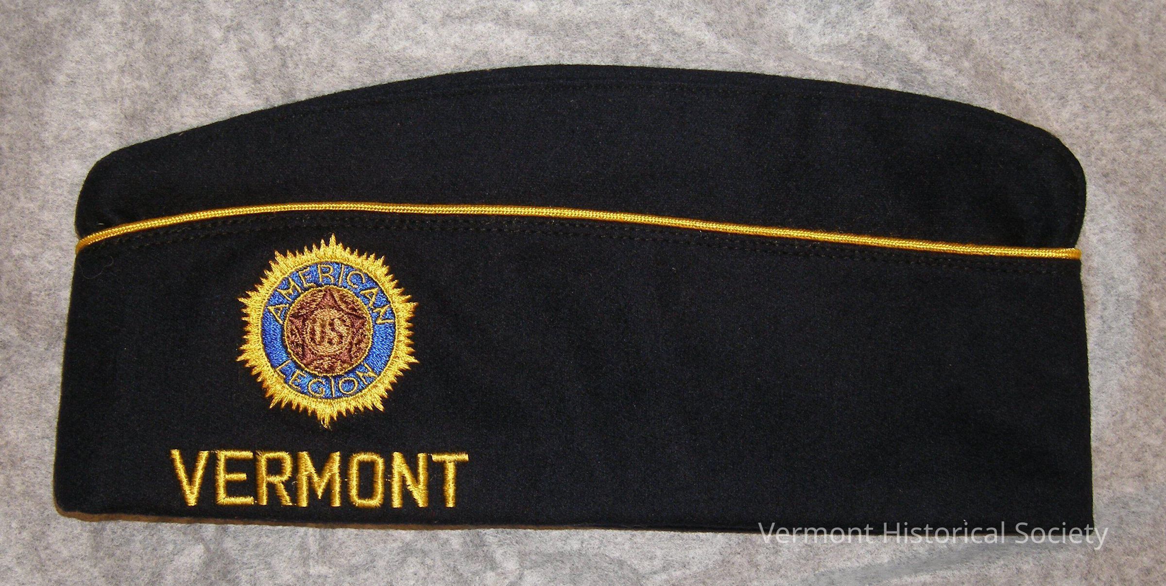 Black wool garrison cap. There is gold-colored piping along the edge of the brim. The brim is embroidered in yellow with the word "VERMONT" and the number "22" and in yellow and blue with the insignia of the American Legion. There is a brown leather band around the interior of the opening with the partial label "Mrs." written on it in ink.