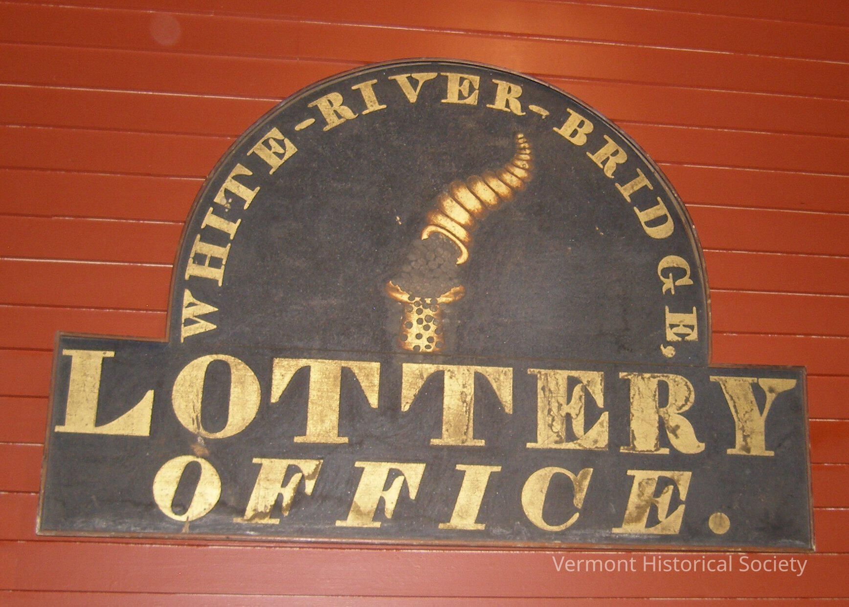 Wooden sign with the gold-painted inscription, "WHITE-RIVER-BRIDGE, LOTTERY OFFICE." The sign consists of a half-circle above a rectangle. The whole is painted black and textured with sand. At the center of the sign is a painting of a cornucopia tilting downward to pour coins into an upturned top hat. The sign is framed with a narrow piece of wood.