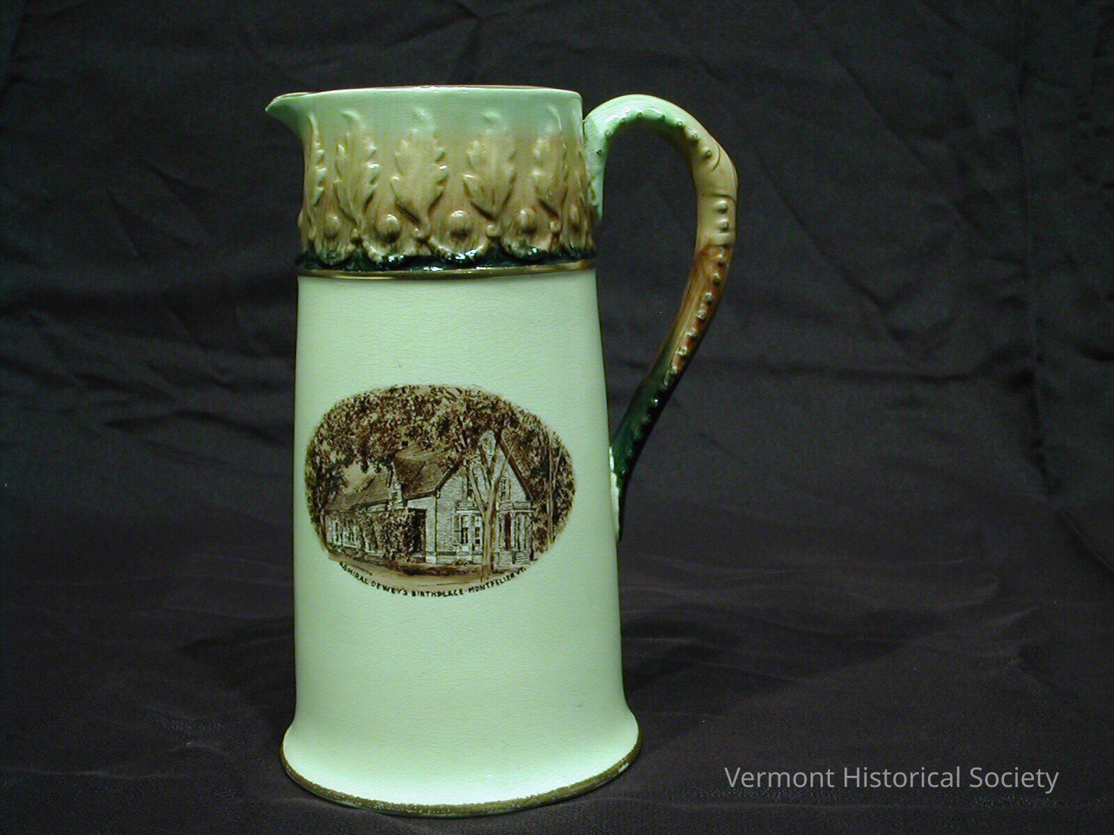 Souvenir pitcher showing a transfer-printed image of a house. The upper portion of the pitcher is molded with a repeated pattern of oak or acanthus leaves, painted in a gradient from black to brown to cream. The handle is molded with dots and painted with the same gradient. The body is printed with a oval containing a scene of a house with the label "ADMIRAL DEWEY'S BIRTHPLACE . MONTPELIER, VT."Context