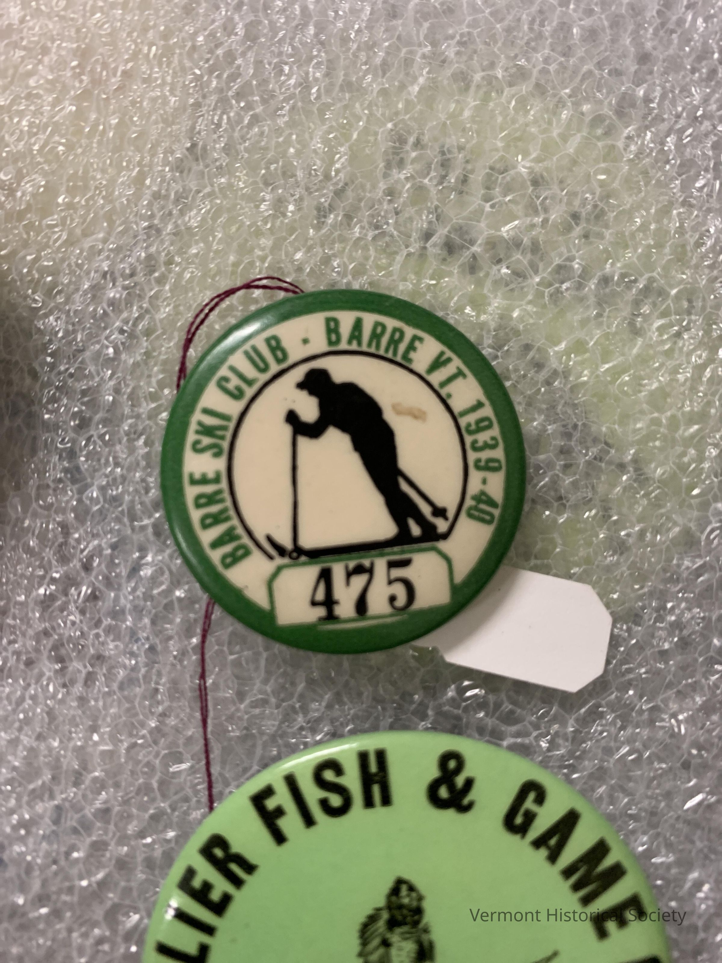 Green and cream pin with a black silhouette of a skier in the center and the number 475 in a box at the bottom. Around the edge in green lettering are the words, "Barre Ski Club, Barre, Vt., 1939-40".Context