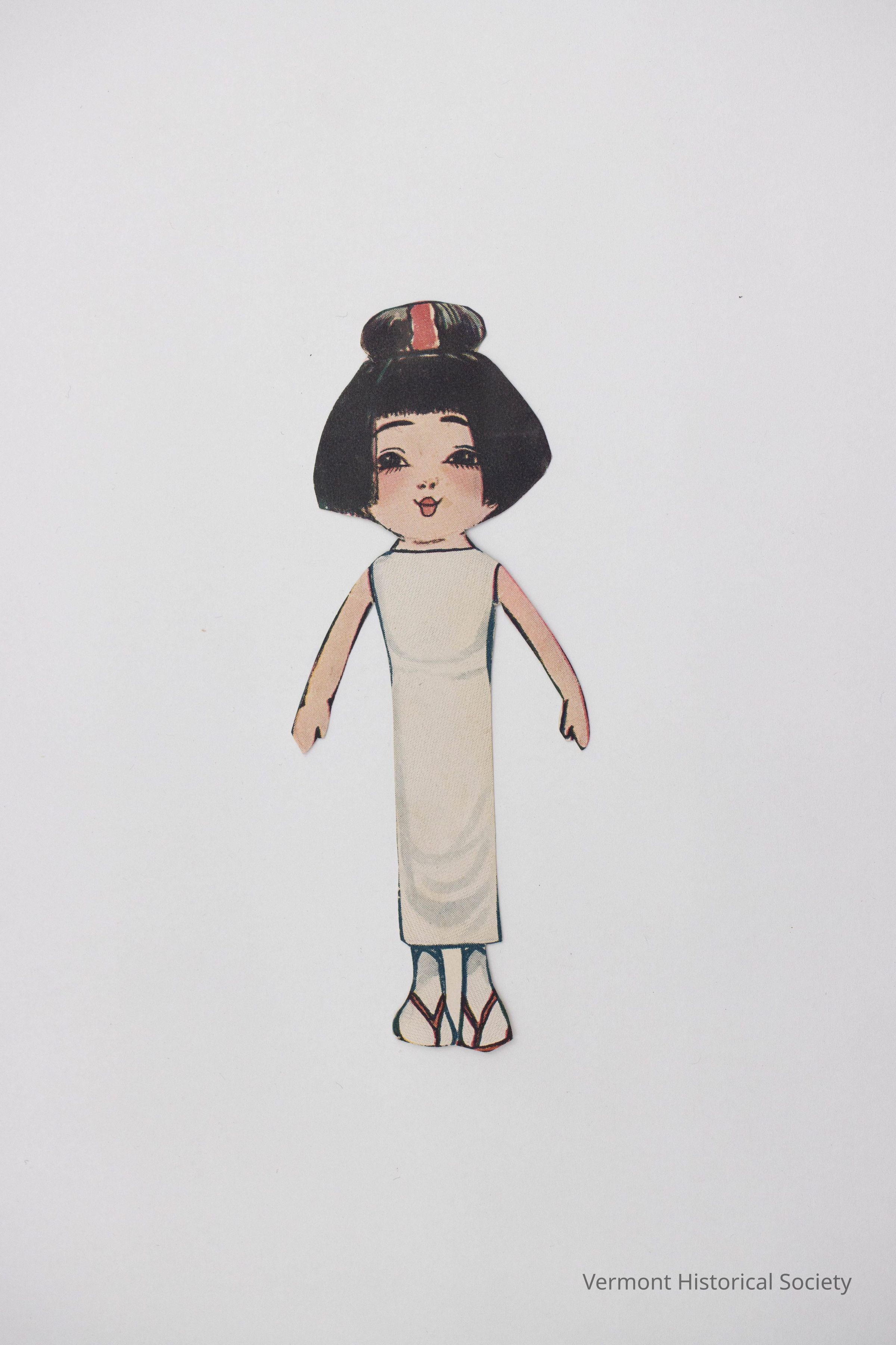 Printed paper doll showing a woman with pink skin and black hair. The hair is in a straight bob with a bun at the center top. It is wearing a white underdress with an unshaped, rectangular body. The shoes and red sandals over white stockings. The doll is meant to depict a Japanese woman. The back shows a portion of a magazine page and the handwritten label "Earne" or "Carne".Context