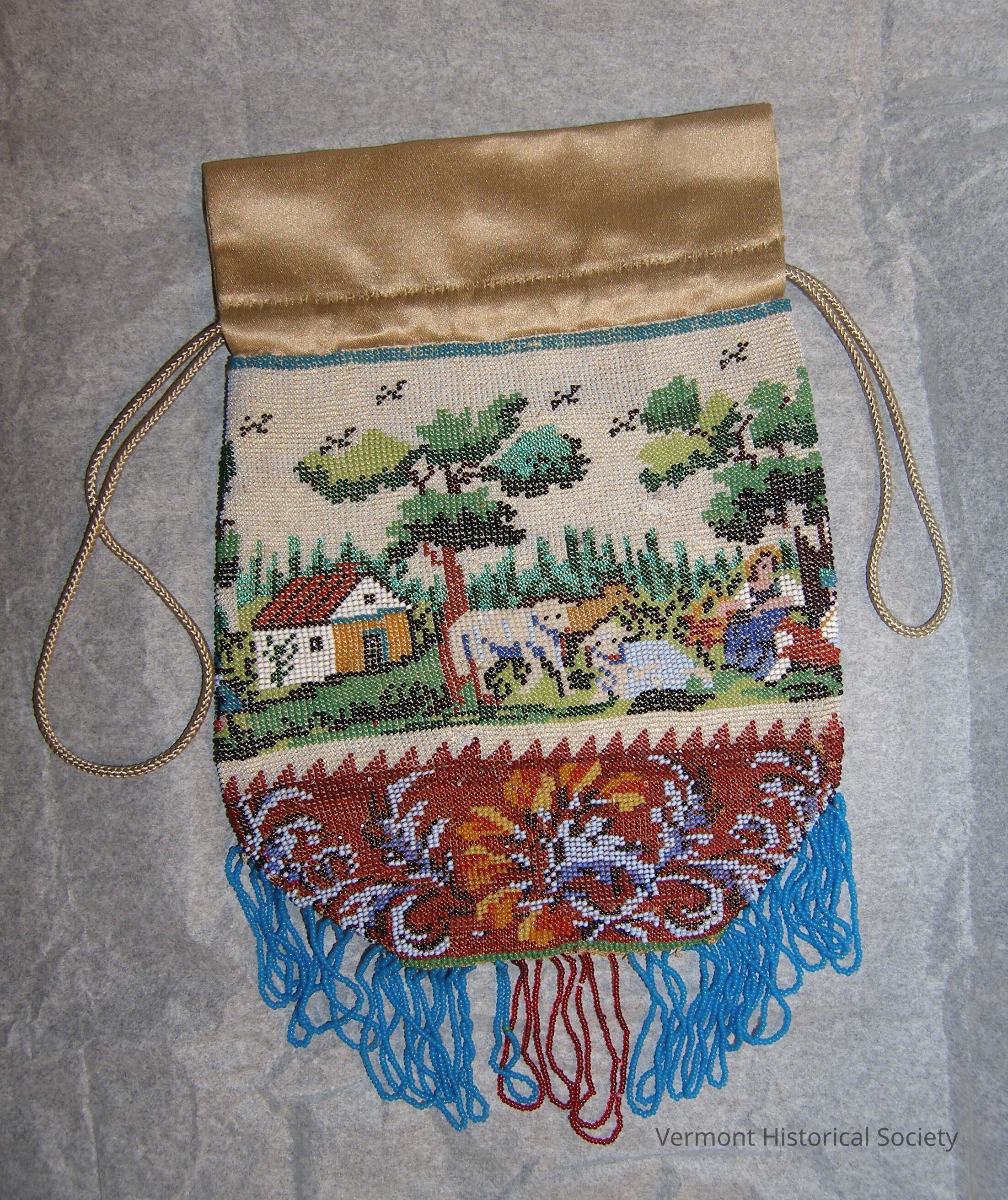 Small purse made of loom-woven glass seed beads. The beads form a pastoral design showing two sheep, a deer, a shepherdess, and a shepherd in a yard by a house. The bottom has a floral border on red ground and is edged with looped fringe in blue and red beads. The purse closes uses a drawstring at the top.
