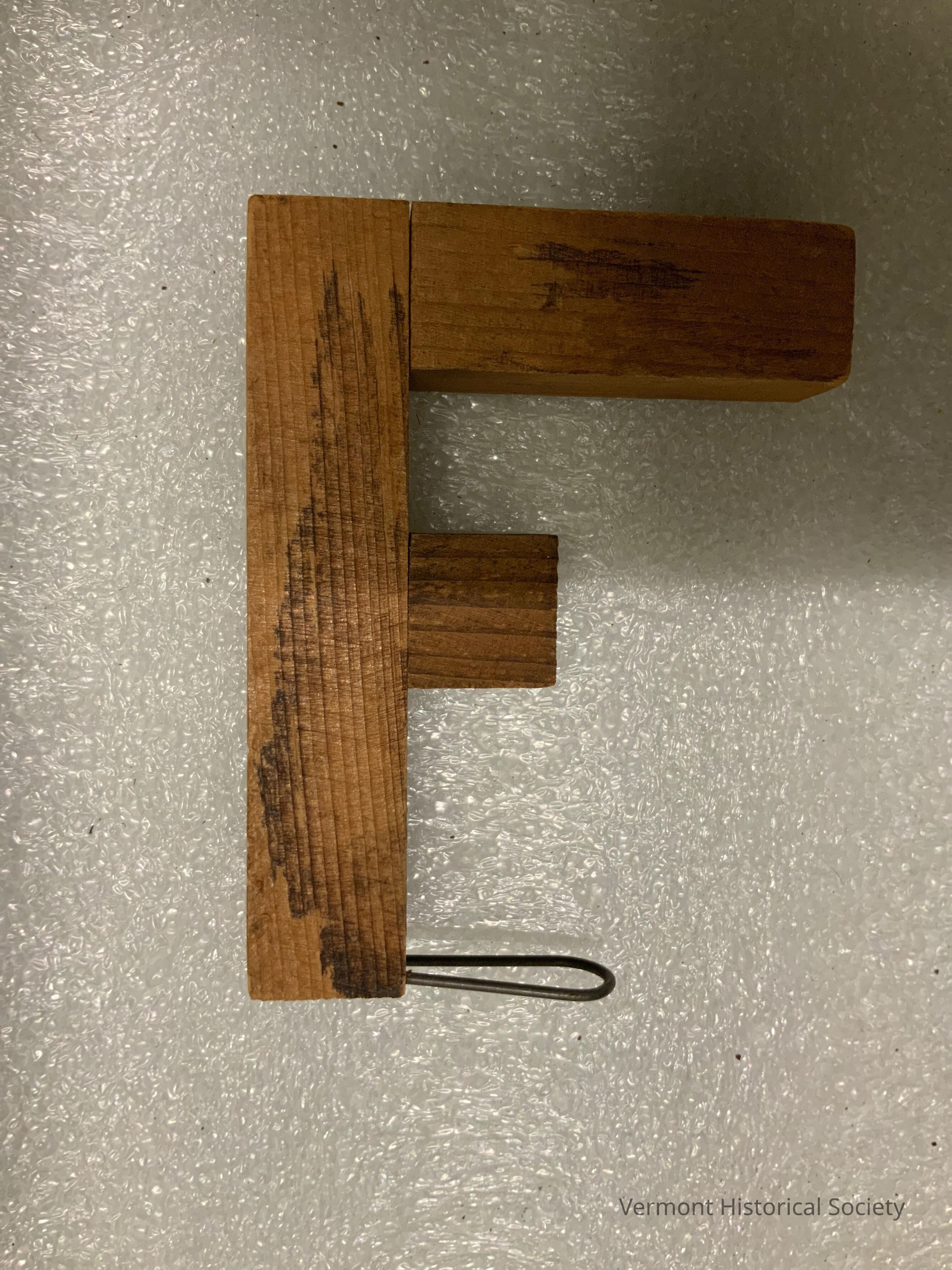 Wooden block in the shape of the letter F. There is a loop of wire at the base of the block.
